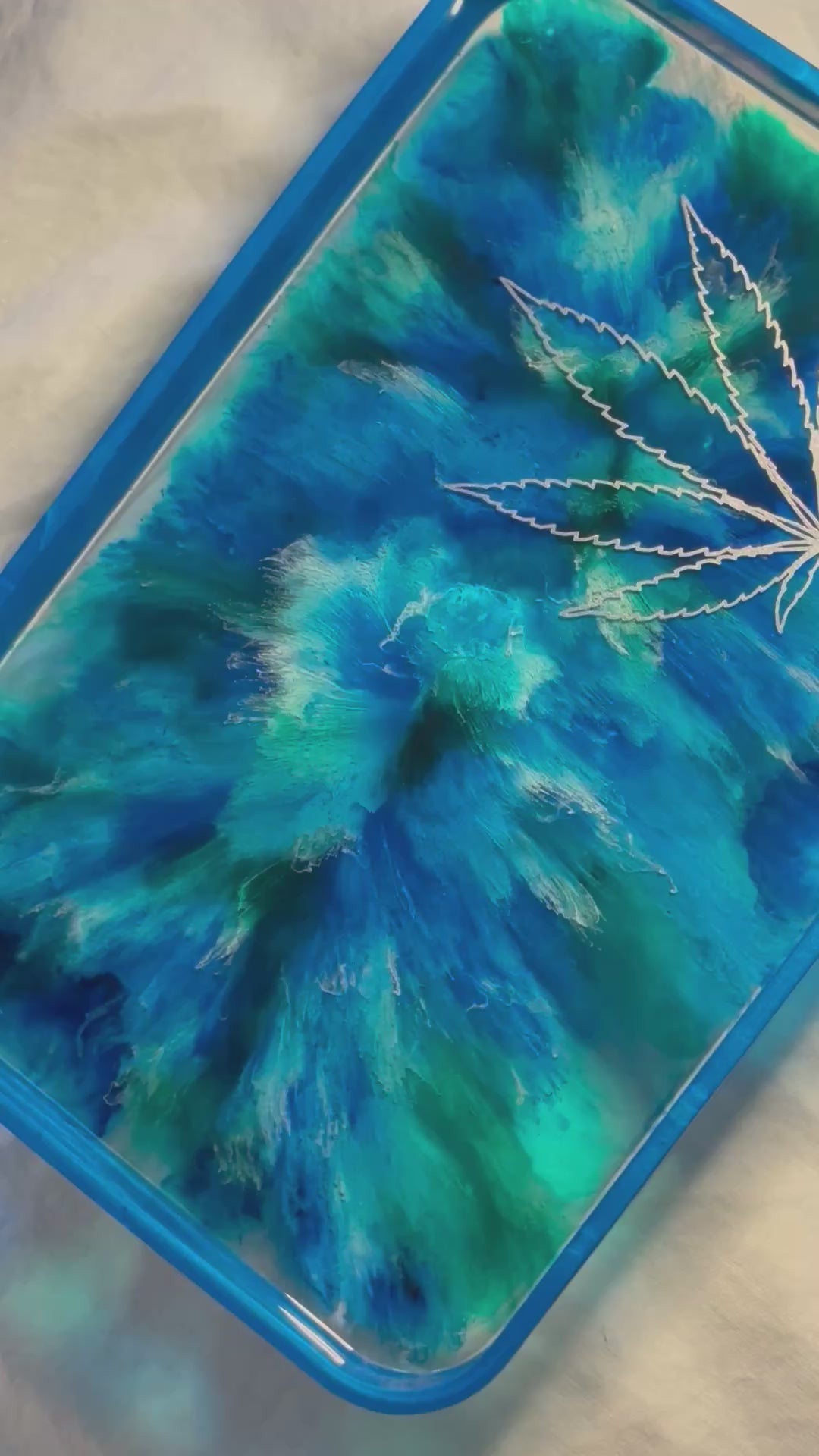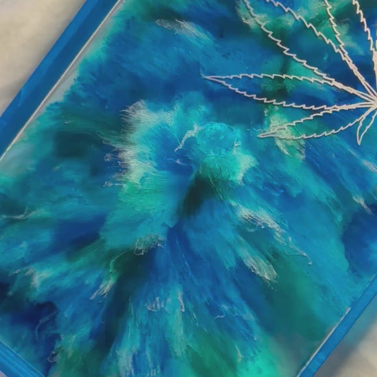 Elevate your rolling experience with this handcrafted resin rolling tray, featuring a Mary Jane leaf design. Swirls of blue and white alcohol ink create a dynamic, fluid background that makes it truly one-of-a-kind. Sleek, durable, and functional, it’s perfect for daily use or as a standout decorative piece.