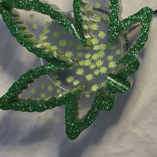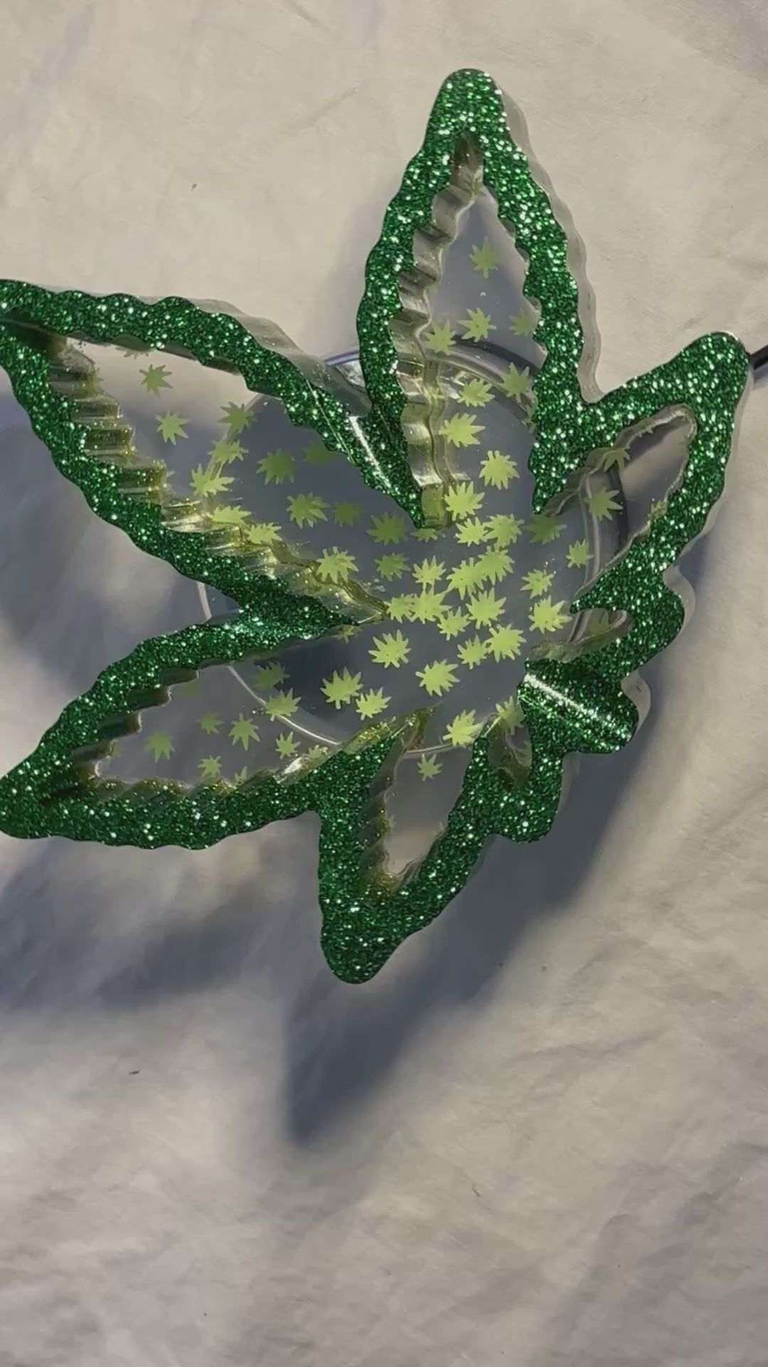 Bring a touch of fun and magic to your space with this handcrafted resin ashtray! Featuring sparkling green glitter and glow-in-the-dark Mary Jane leaves at the center, it’s both functional and eye-catching, making it a standout piece for your home or smoking area.