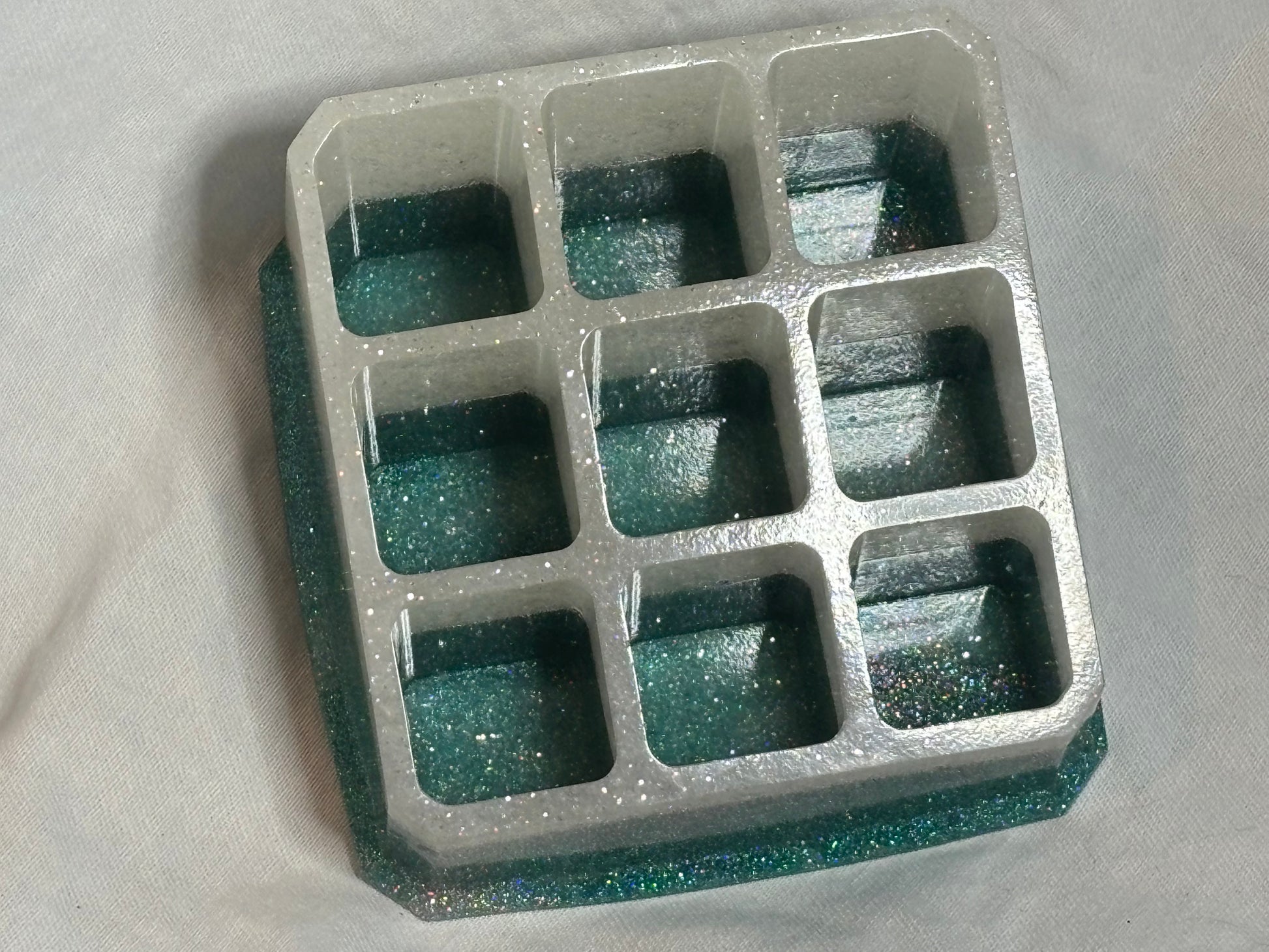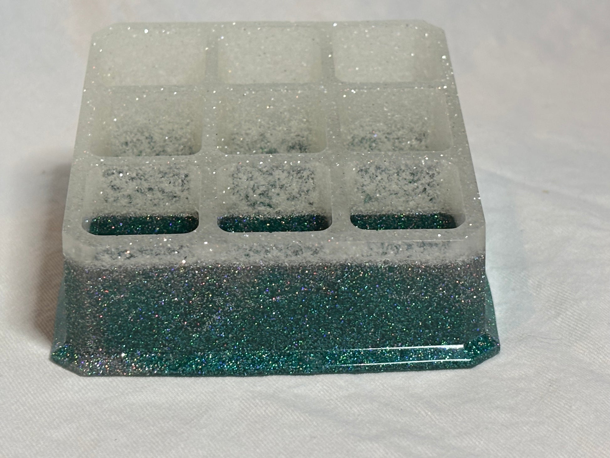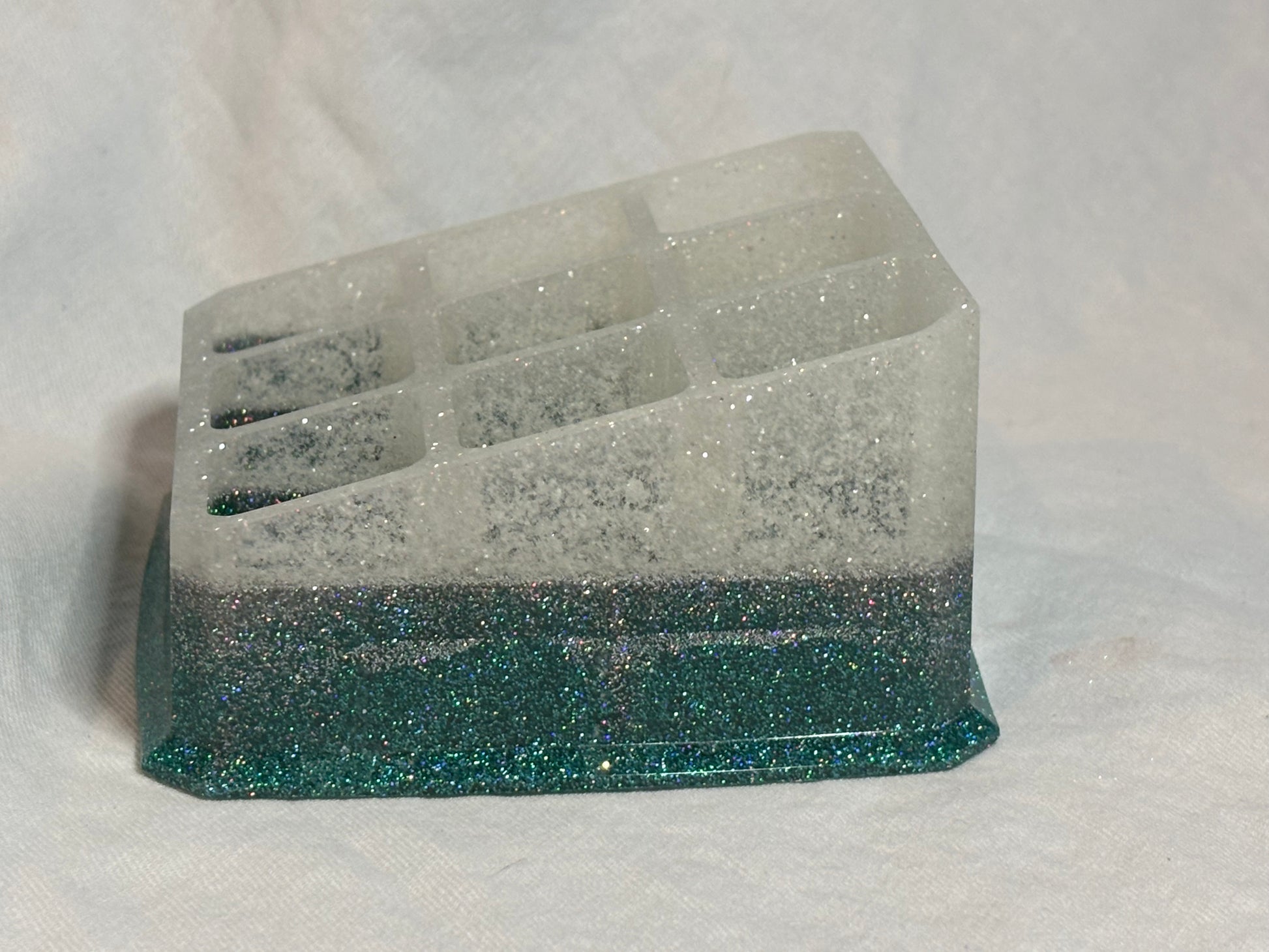 Say goodbye to cluttered makeup counters with this handcrafted resin cosmetic organizer, featuring sparkling white glitter on the top half and vibrant teal glitter on the bottom! With 9 perfectly sized slots, it’s ideal for holding lipsticks, mascaras, and other favorite beauty essentials.