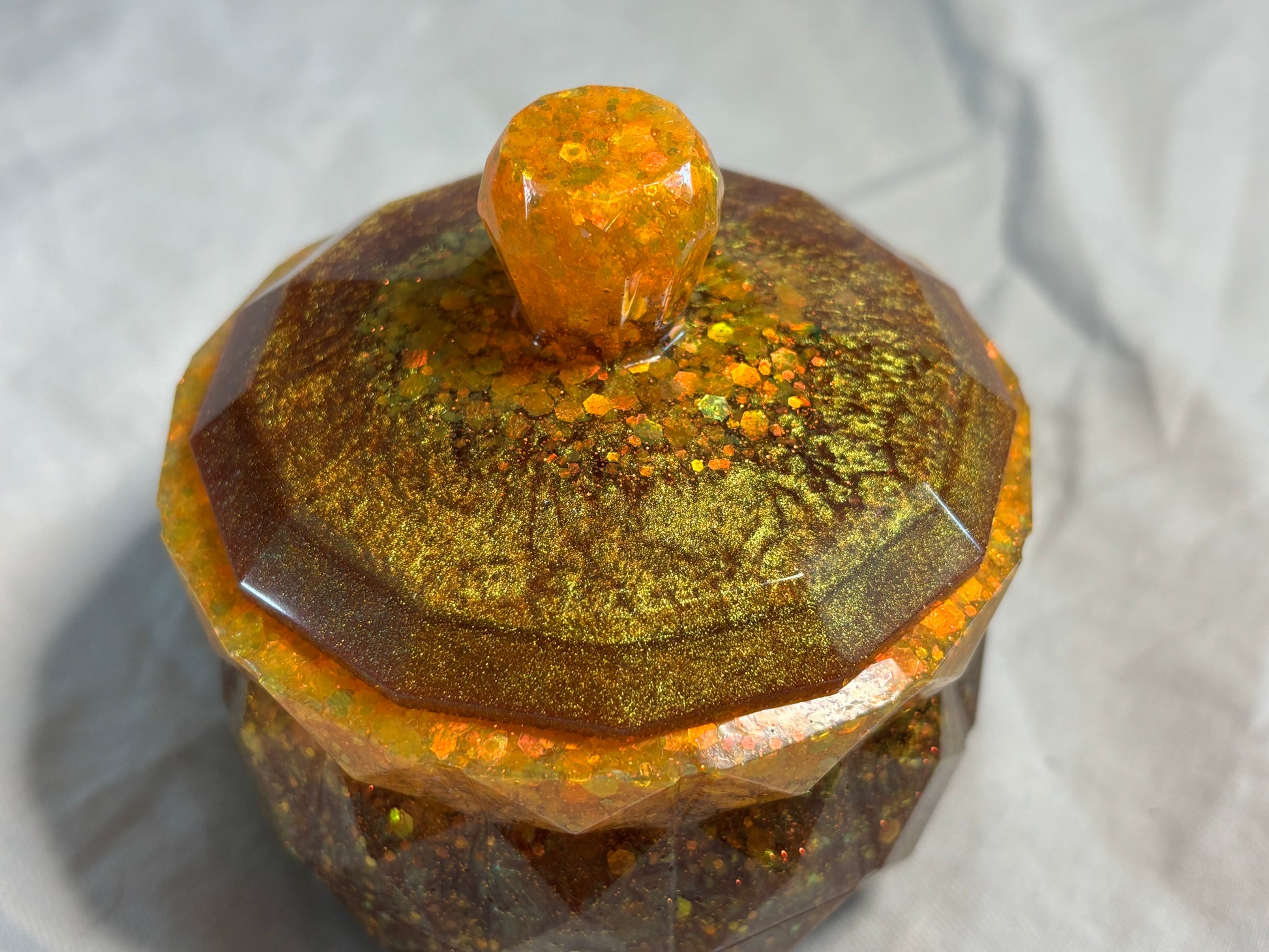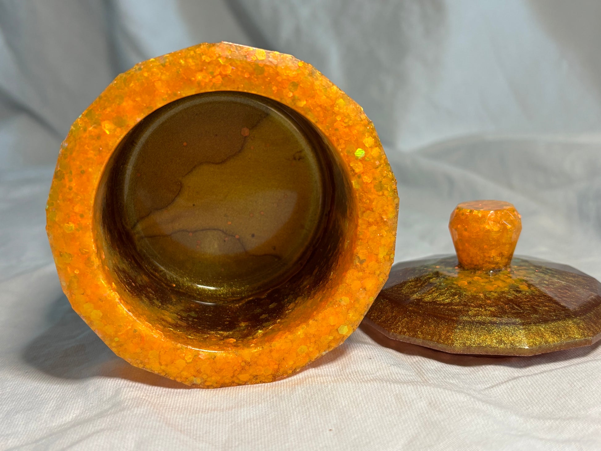 - Layered design with chunky orange glitter and deep gold resin for rich dimension
