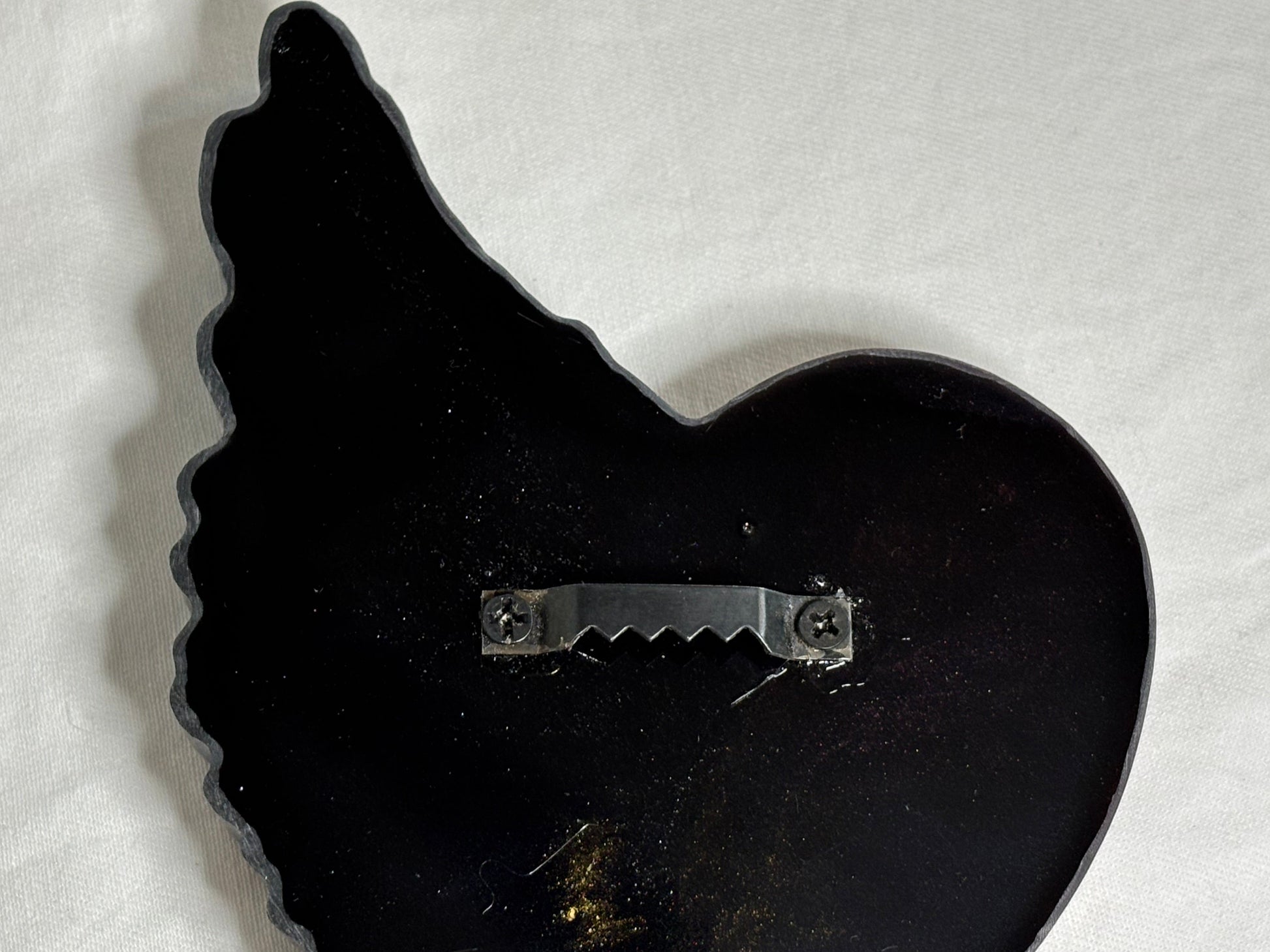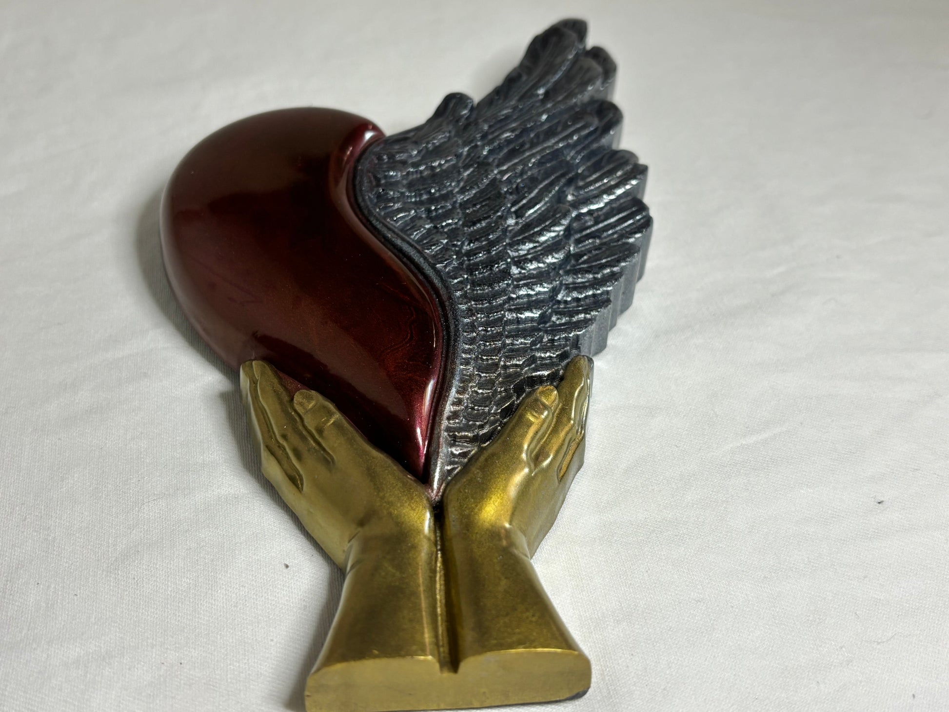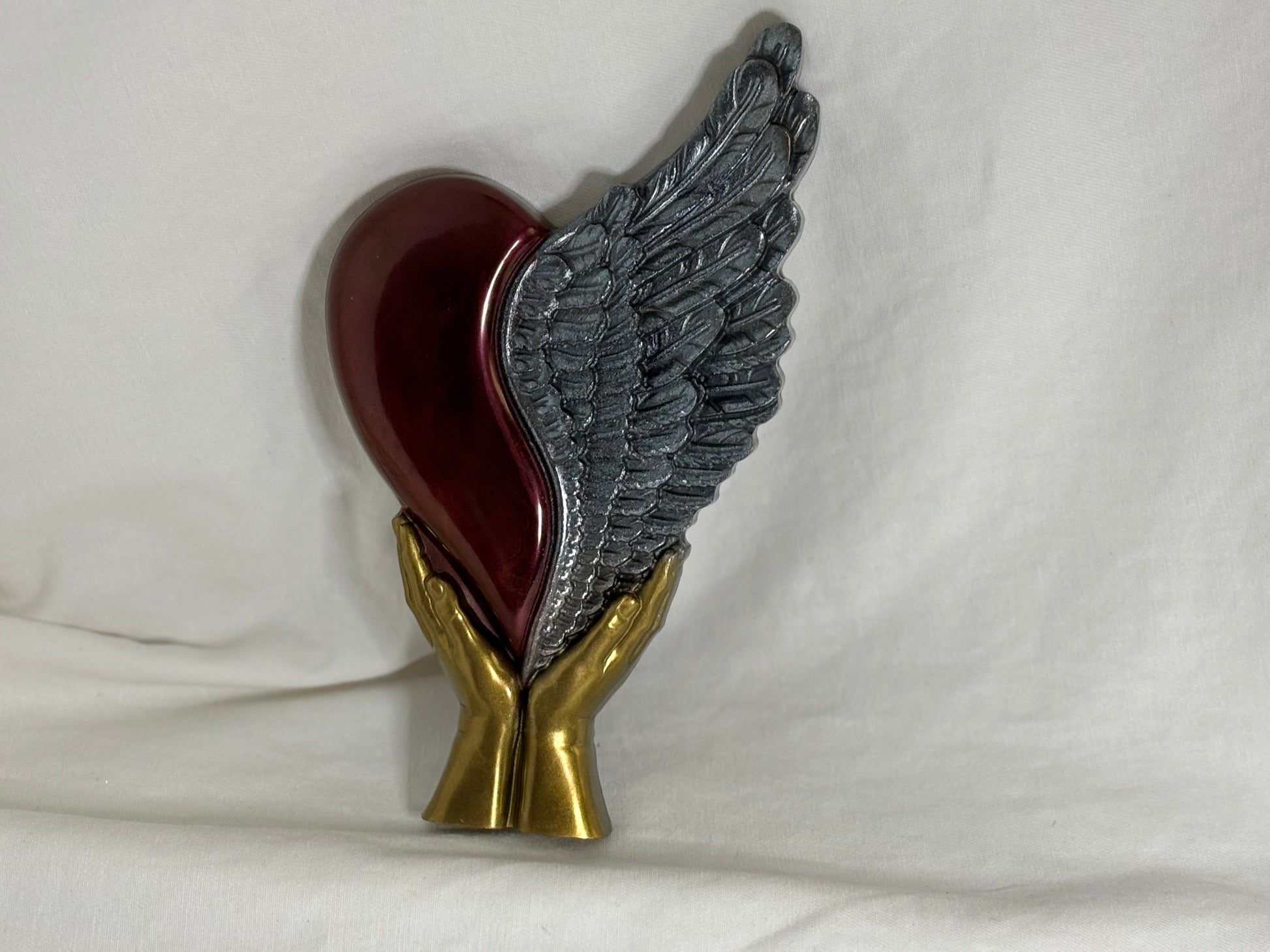 This striking resin creation features a pair of radiant golden hands (crafted with shimmering gold mica powder) gently holding a symbolic centerpiece — a heart split in half. One half shines in deep, passionate red, while the other transforms into angelic silver glitter wings. The design beautifully balances strength, love, and protection, making it a powerful keepsake or gift.