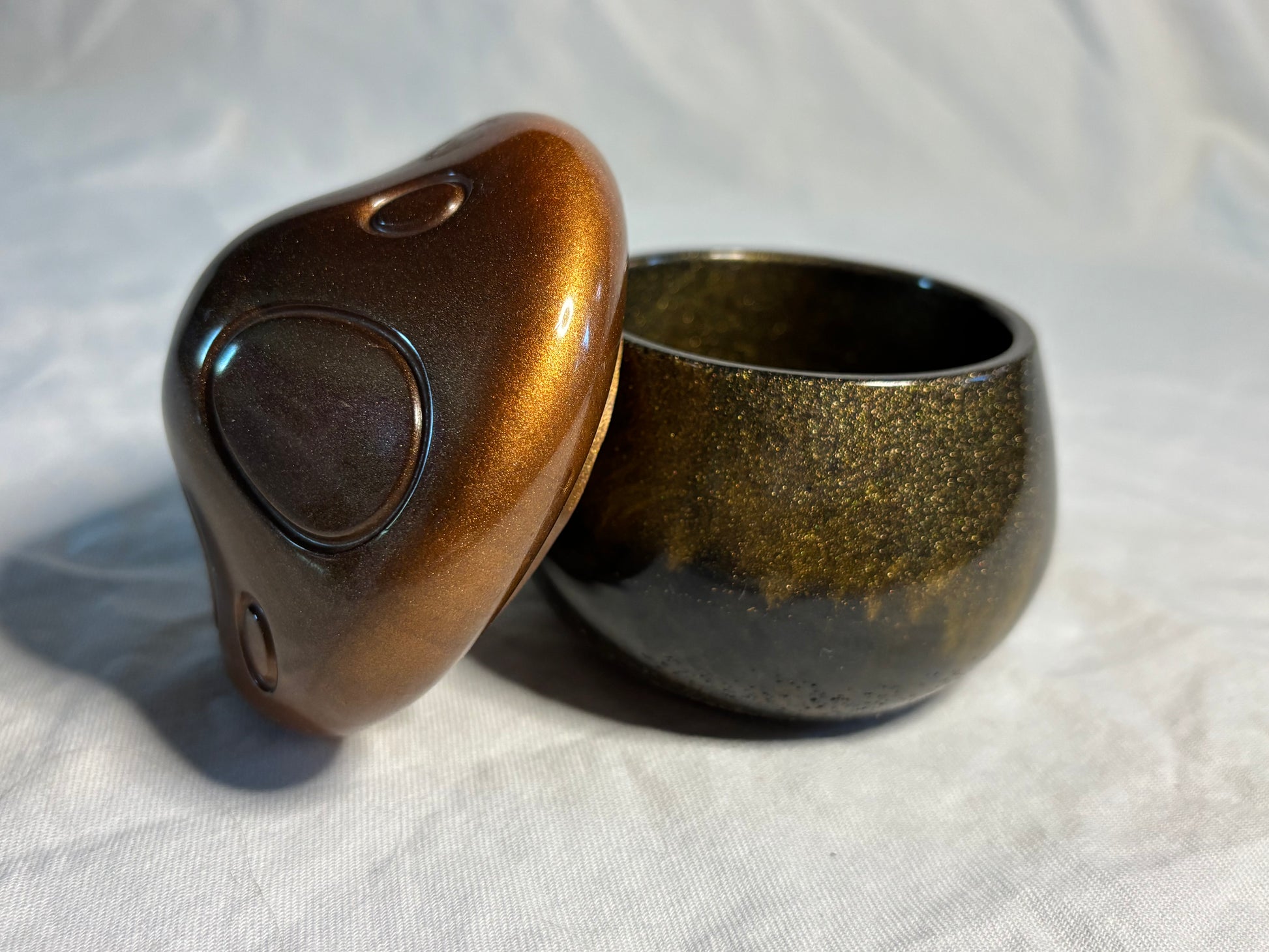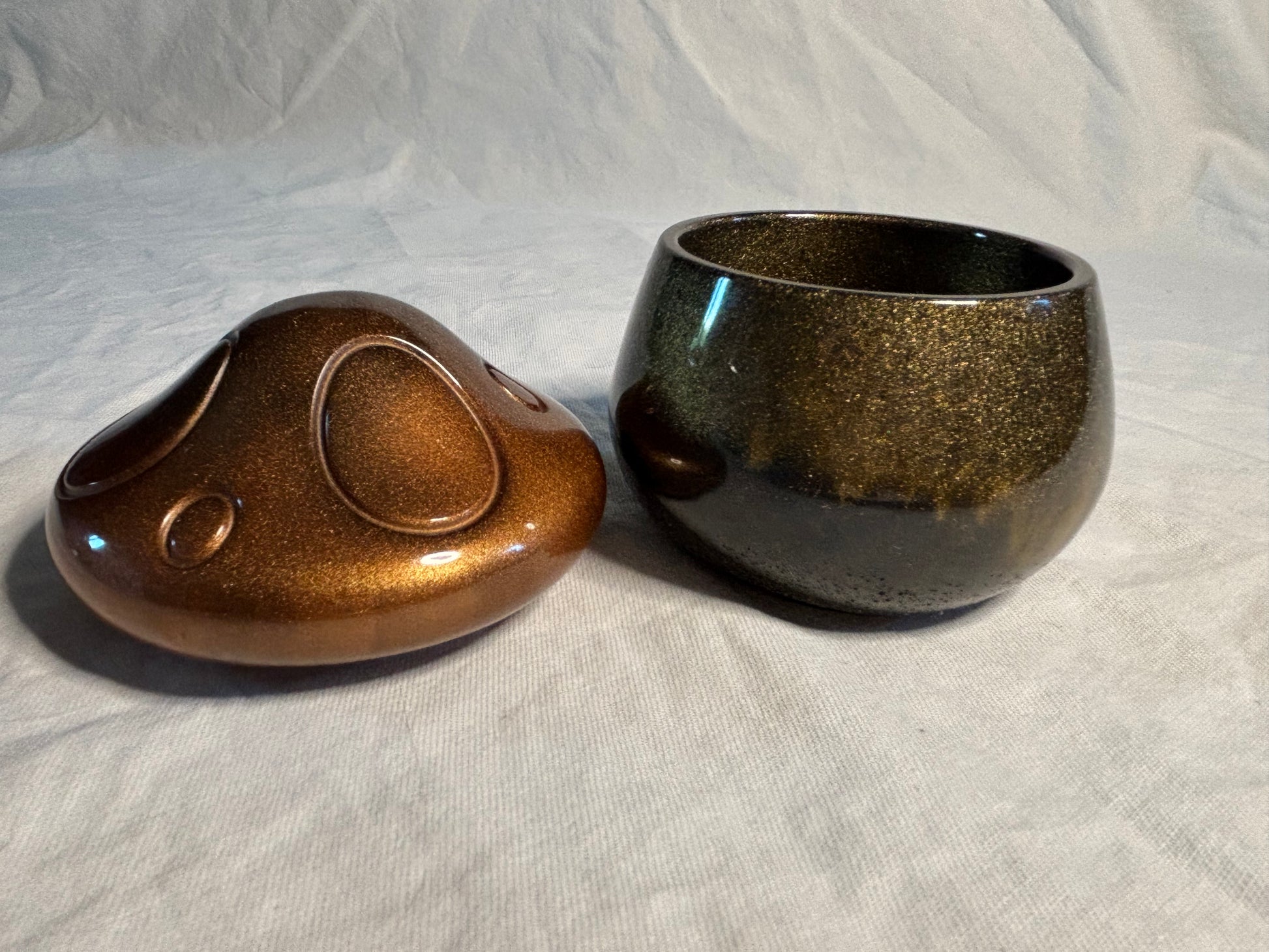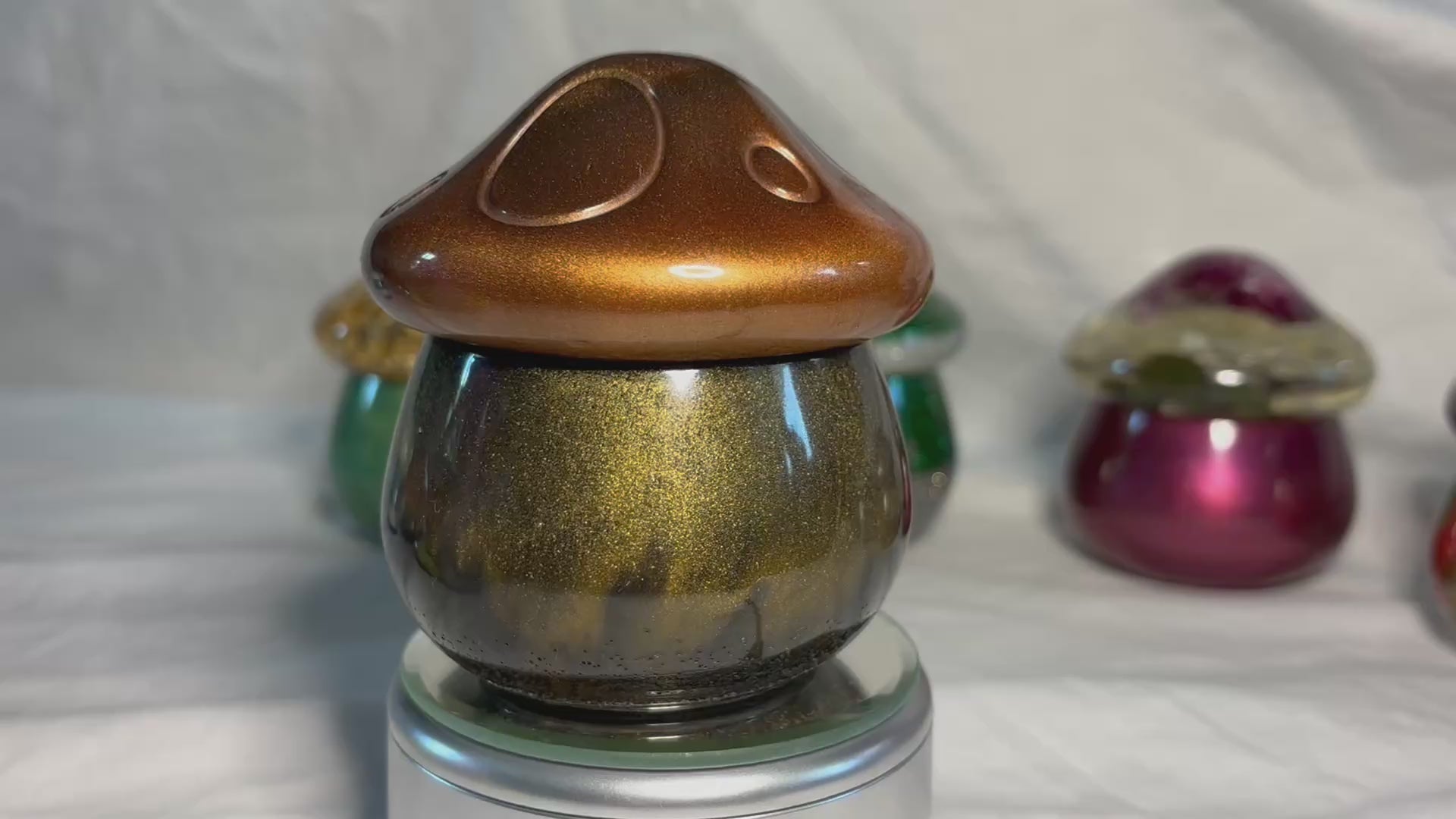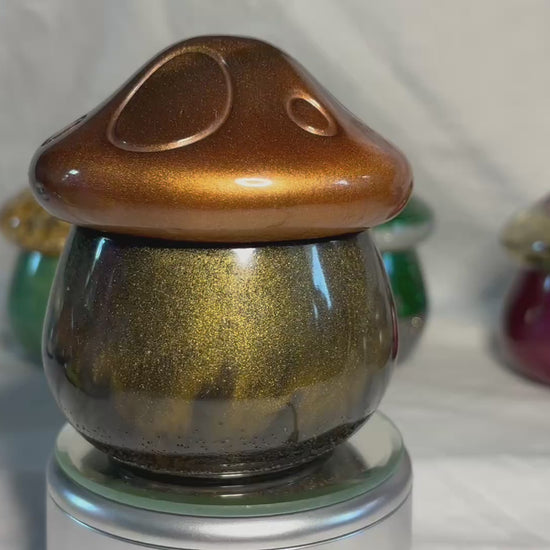 This handcrafted resin mushroom dish shimmers with rich bronze and brown glitter, blending into a soft ombre effect at the base. The enchanting cap design glows warmly in the light, making it perfect for holding small treasures or simply standing out as a magical decorative accent.
