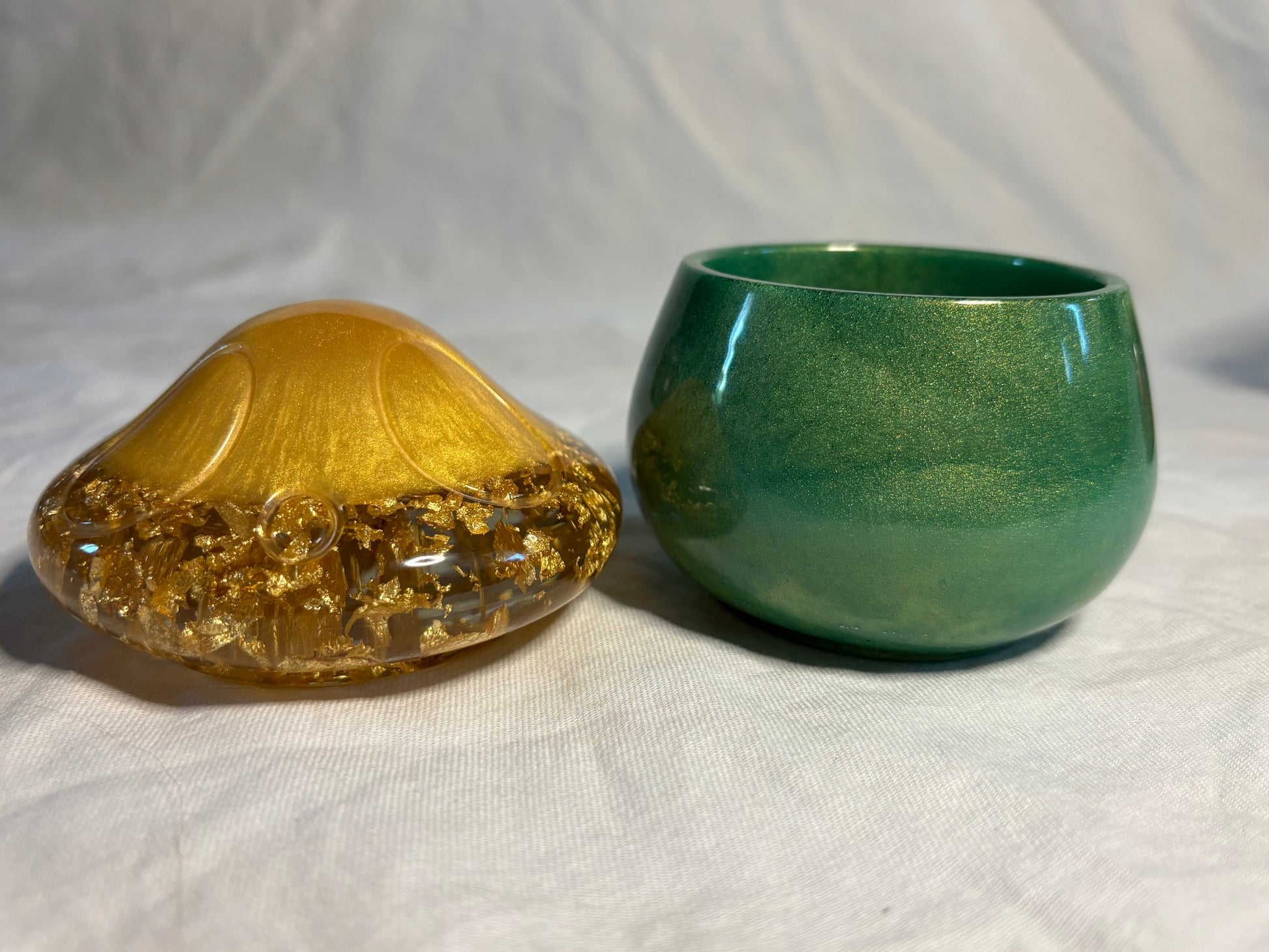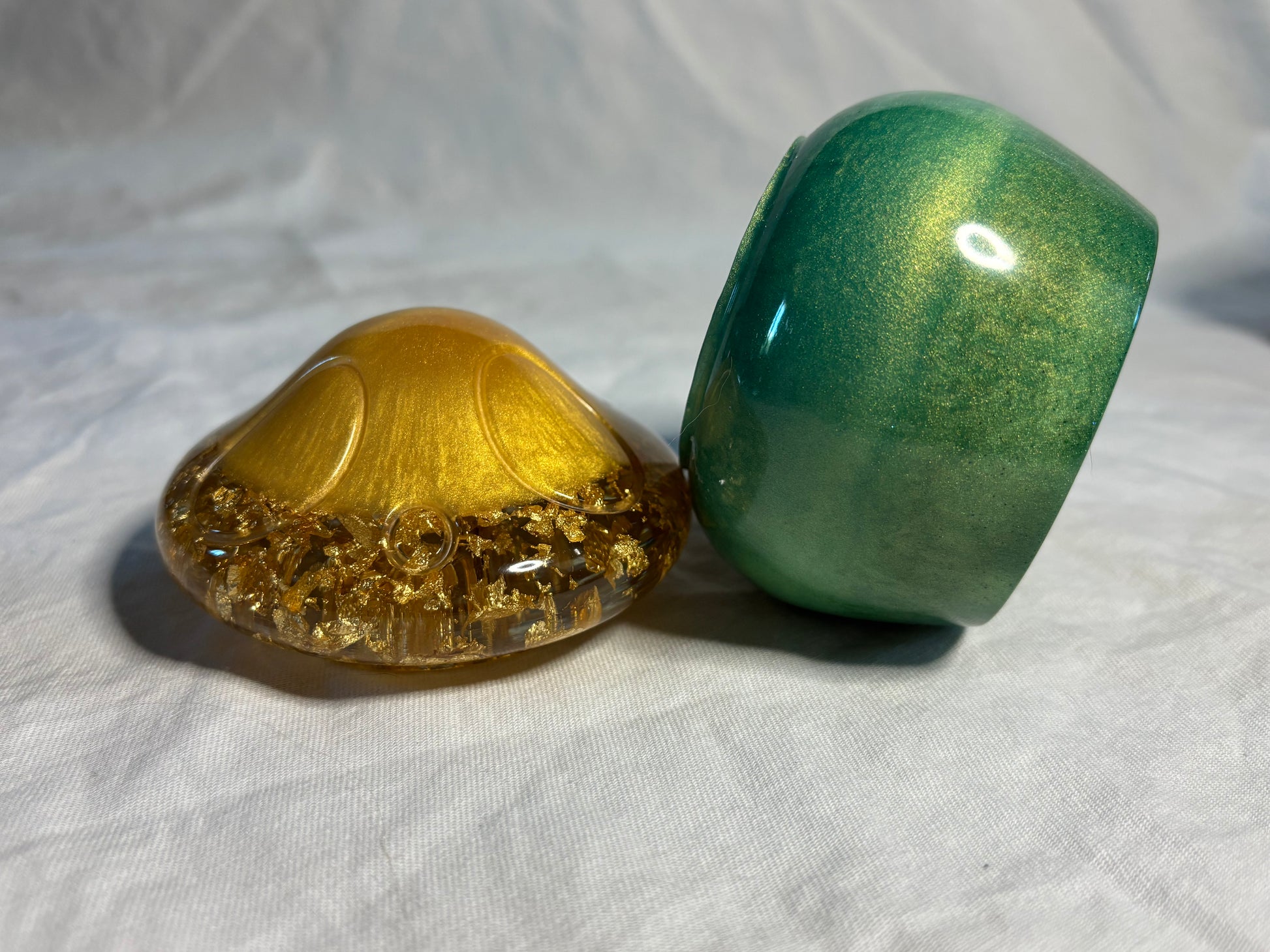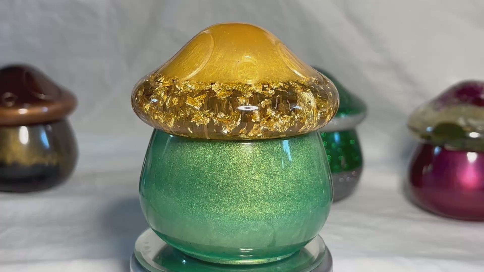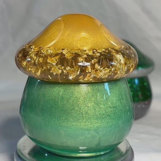 Bring home a touch of fairy-tale luxury! This whimsical resin mushroom jar features a shimmery green base and a golden, flake-kissed top, making it equal parts functional and magical. Use it for storage or display—either way, it’s a conversation piece.