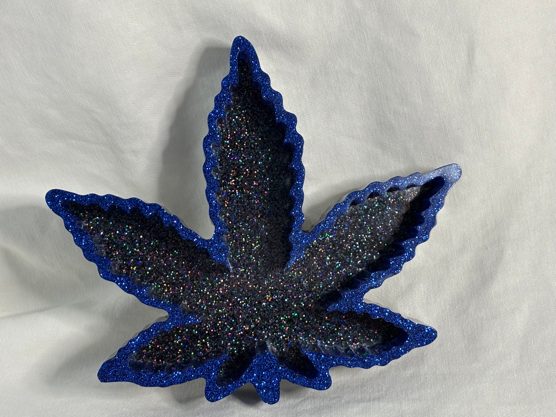 Bring a little shimmer to your smoke space with this handcrafted resin Mary Jane leaf trinket dish. Designed with a Vegas Nights (dark) glitter bottom and sparkling blue glitter edges, this dish delivers a bold, moody glow that’s perfect for stylish organization. Ideal for holding jewelry, trinkets, or smoking essentials, it’s as functional as it is decorative.