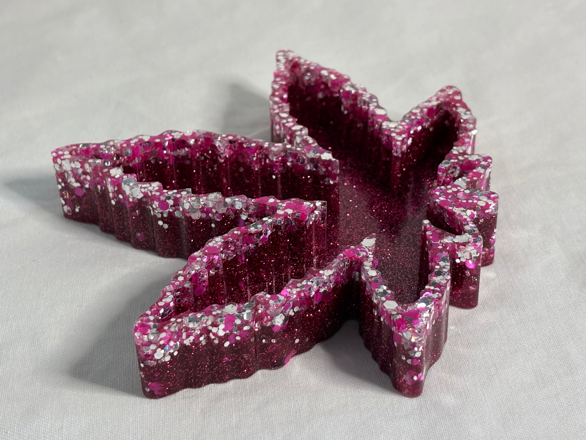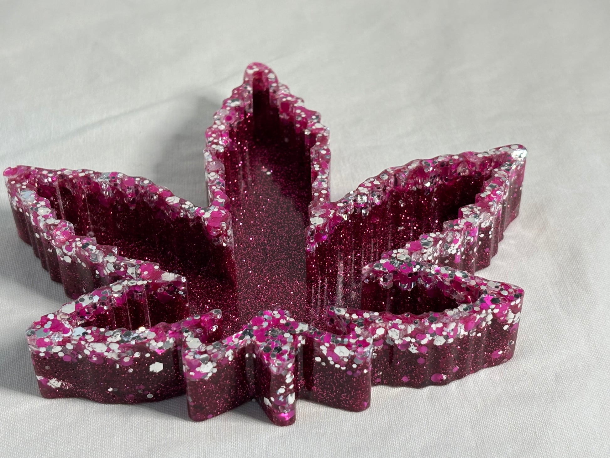 Bring sparkle and charm to your space with this handcrafted resin Mary Jane leaf trinket dish. Made with a stunning blend of pink, white, and silver glitter, it shimmers beautifully in the light. Perfect for holding small treasures, jewelry, or smoking essentials, this compact dish doubles as a decorative accent.