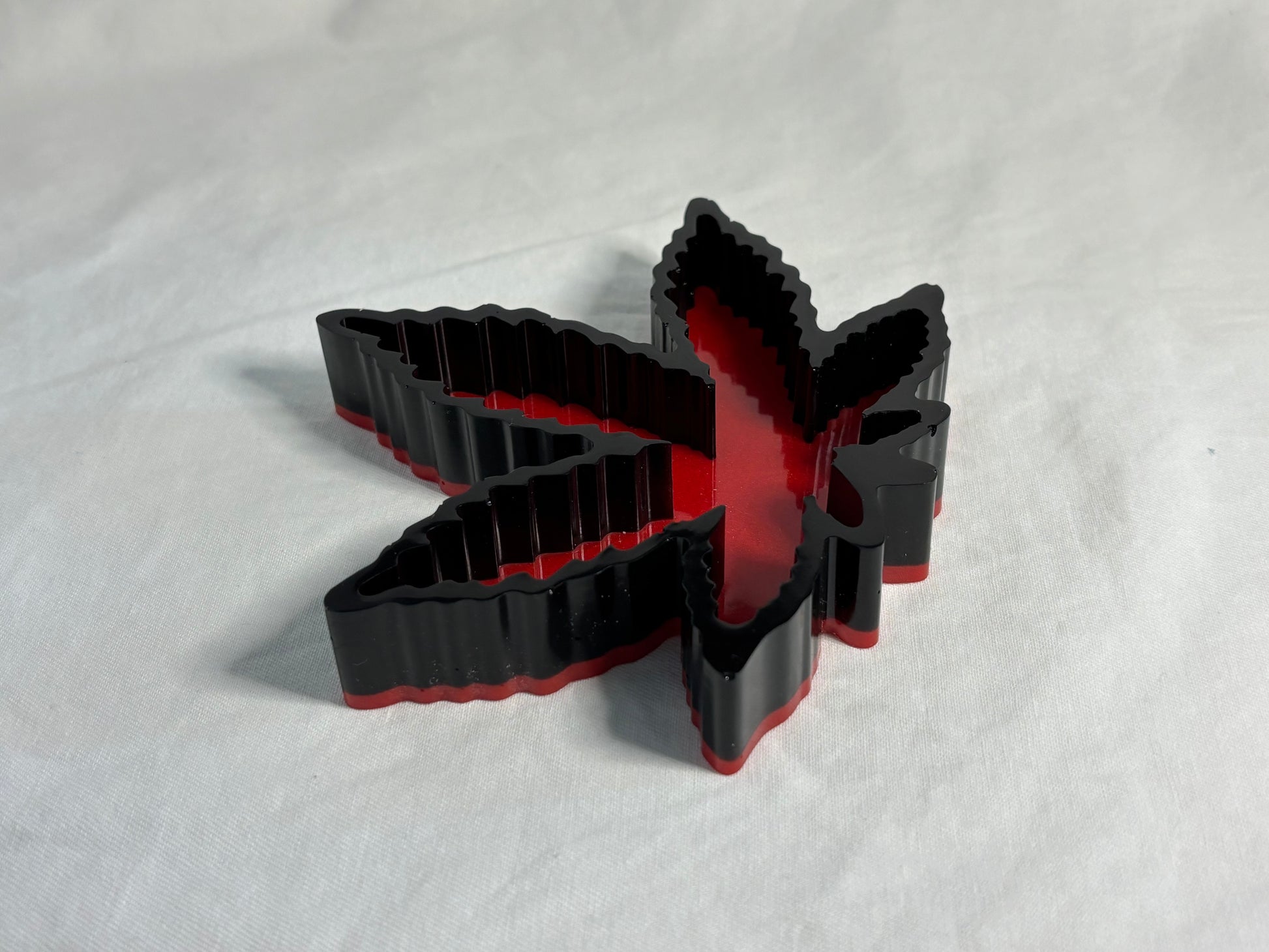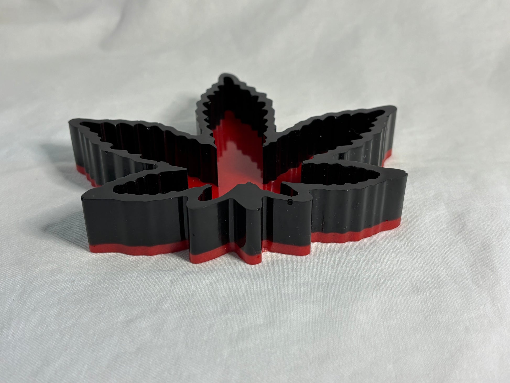 Add bold elegance to your space with this handcrafted resin Mary Jane leaf trinket dish. Featuring a deep red mica bottom and sleek black mica sides, this piece shines with striking contrast and timeless style. Perfect for holding jewelry, trinkets, or smoking essentials, it’s as functional as it is eye-catching.