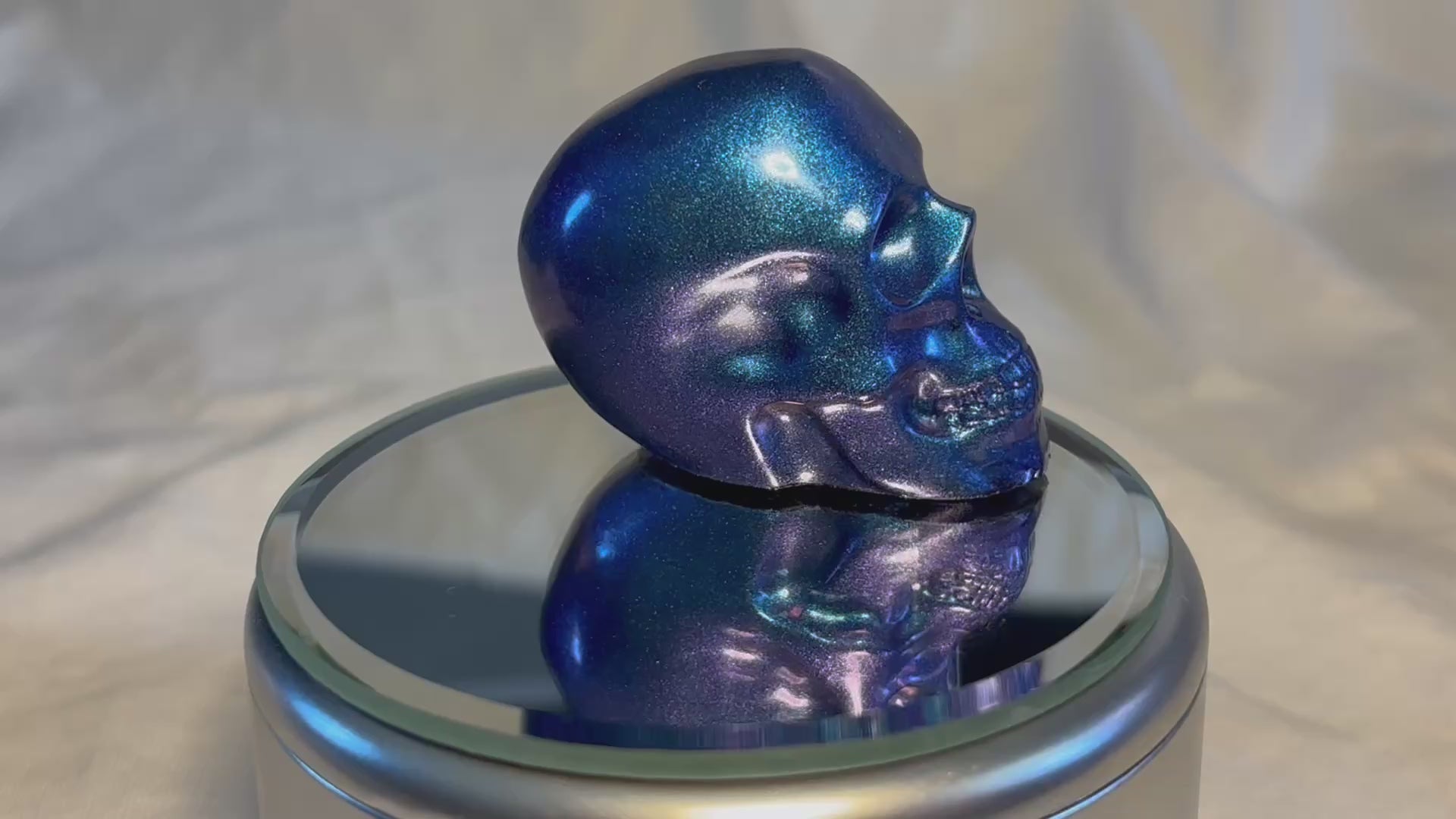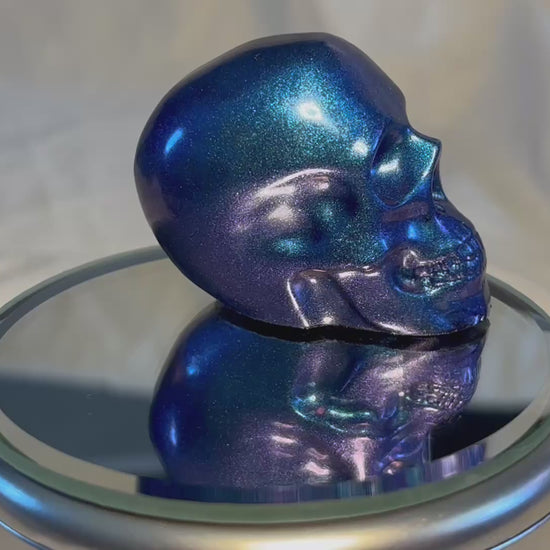 Add a touch of magic and edge to your collection with these metalic "blue" color shifting resin skulls. Measuring approximately 2 inches, each skull shimmers with iridescent hues that change as the light hits—making every piece feel alive and unique. Each skull is individually crafted. Bring a little magic (and a hint of mystery) to your space!