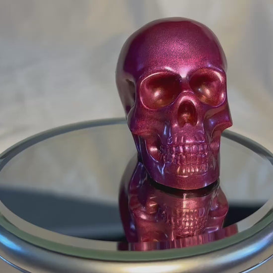 Add a touch of magic and edge to your collection with these metalic color shifting "plum" resin skulls. Measuring approximately 2 inches, each skull shimmers with iridescent hues that change as the light hits—making every piece feel alive and unique. Each skull is individually crafted. Bring a little magic (and a hint of mystery) to your space!