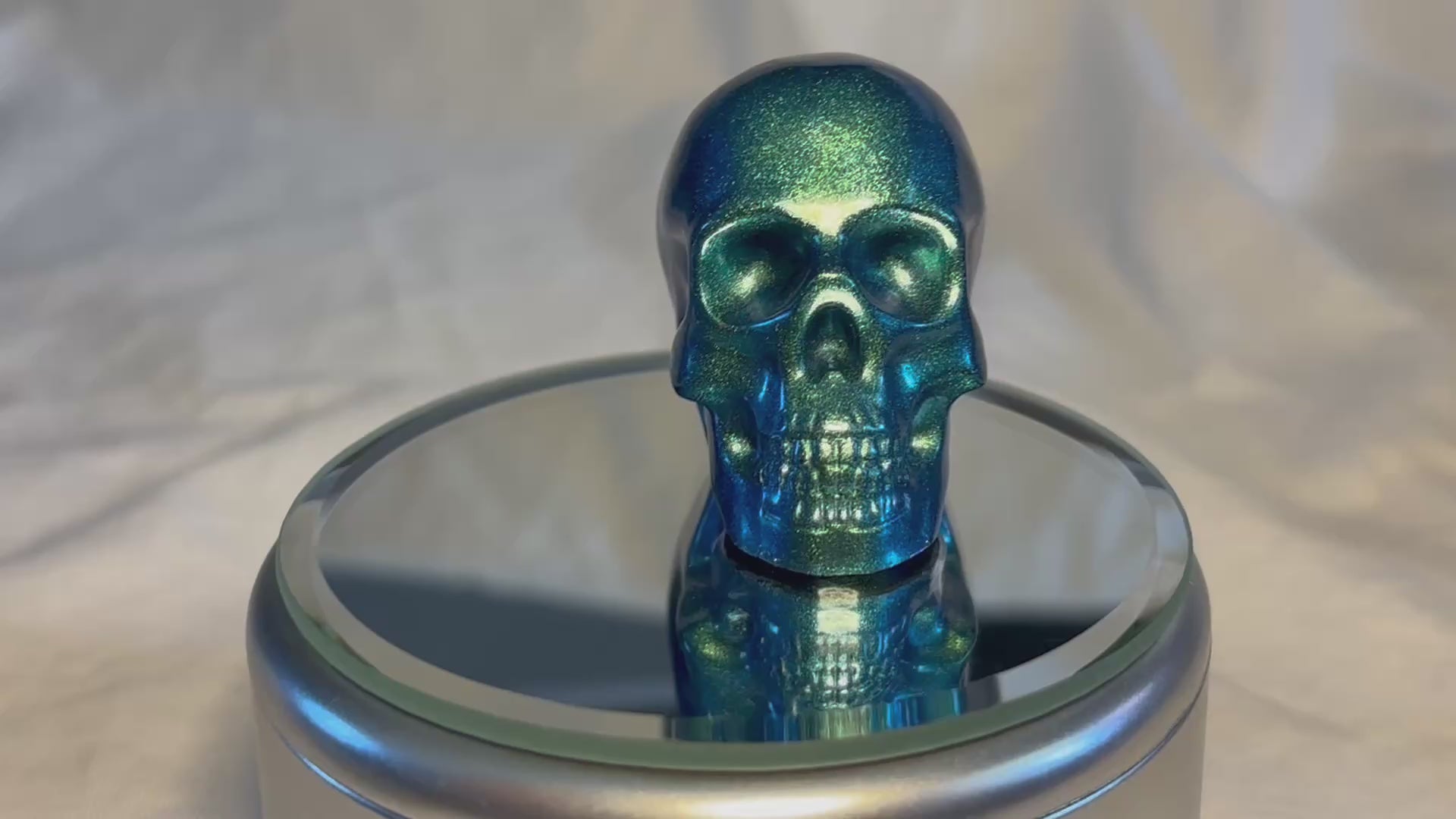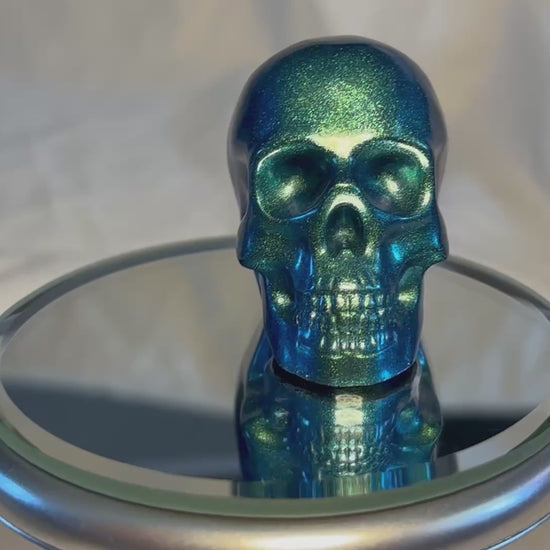 Add a touch of magic and edge to your collection with these "teal" metalic color shifting teal resin skulls. Measuring approximately 2 inches, each skull shimmers with iridescent hues that change as the light hits—making every piece feel alive and unique. Each skull is individually crafted. Bring a little magic (and a hint of mystery) to your space!