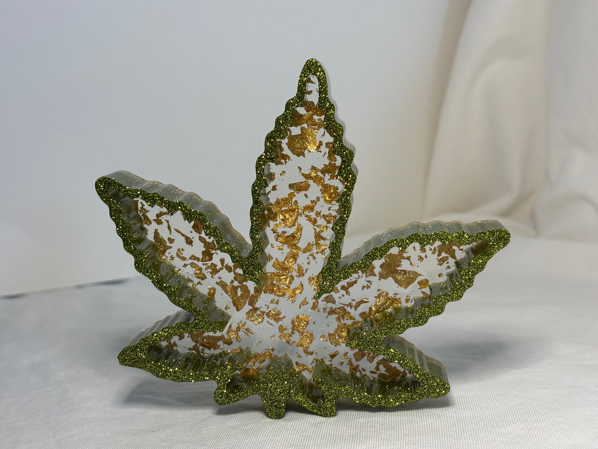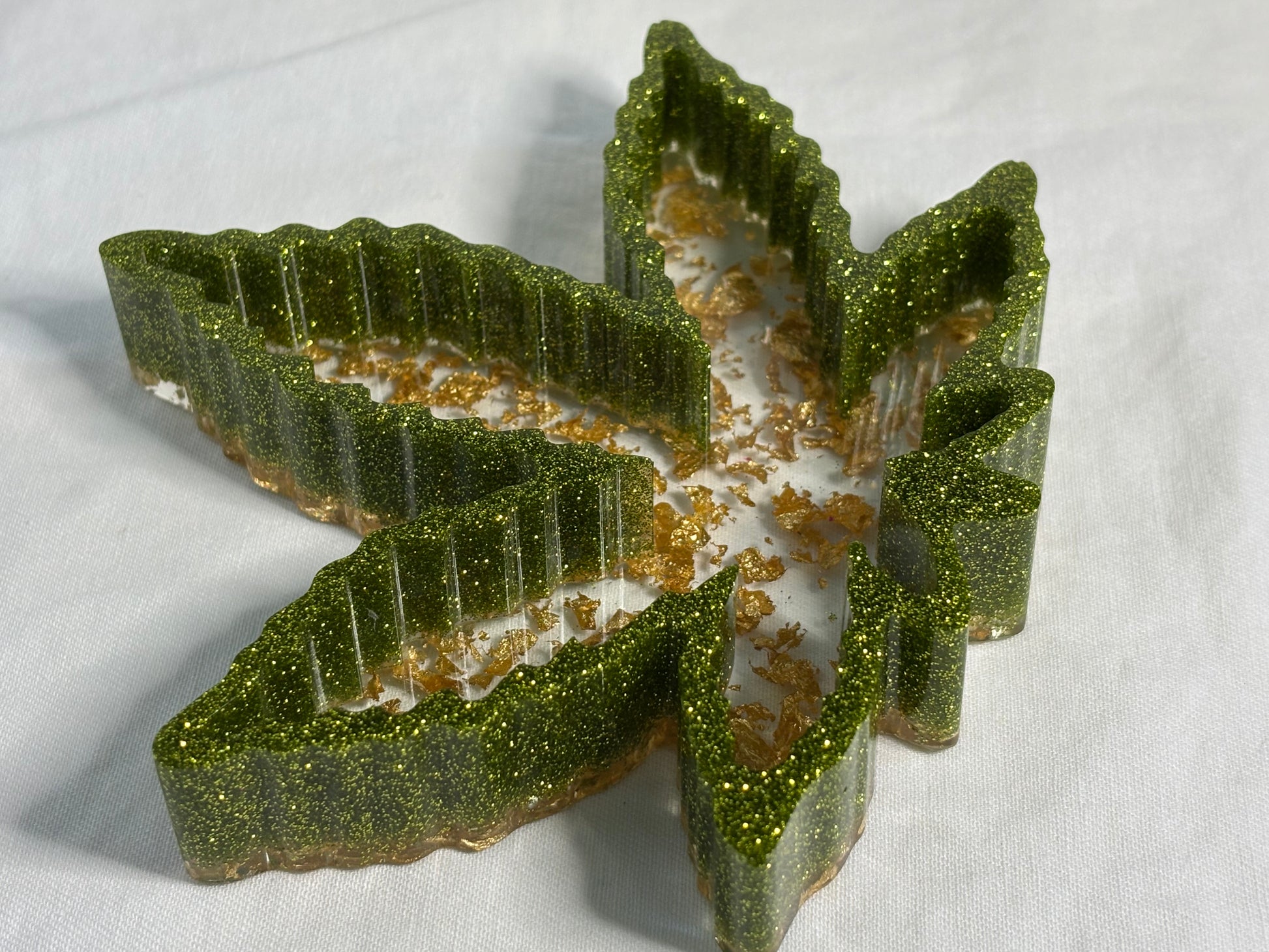 Add a touch of sparkle and style to your smoke space with this handcrafted resin trinket dish. Designed in the shape of a Mary Jane leaf, it shines with vibrant green glitter and catches the light with gold foil flakes, making it as eye-catching as it is practical. Perfect for holding small treasures, rolling essentials, or simply as a decorative accent.