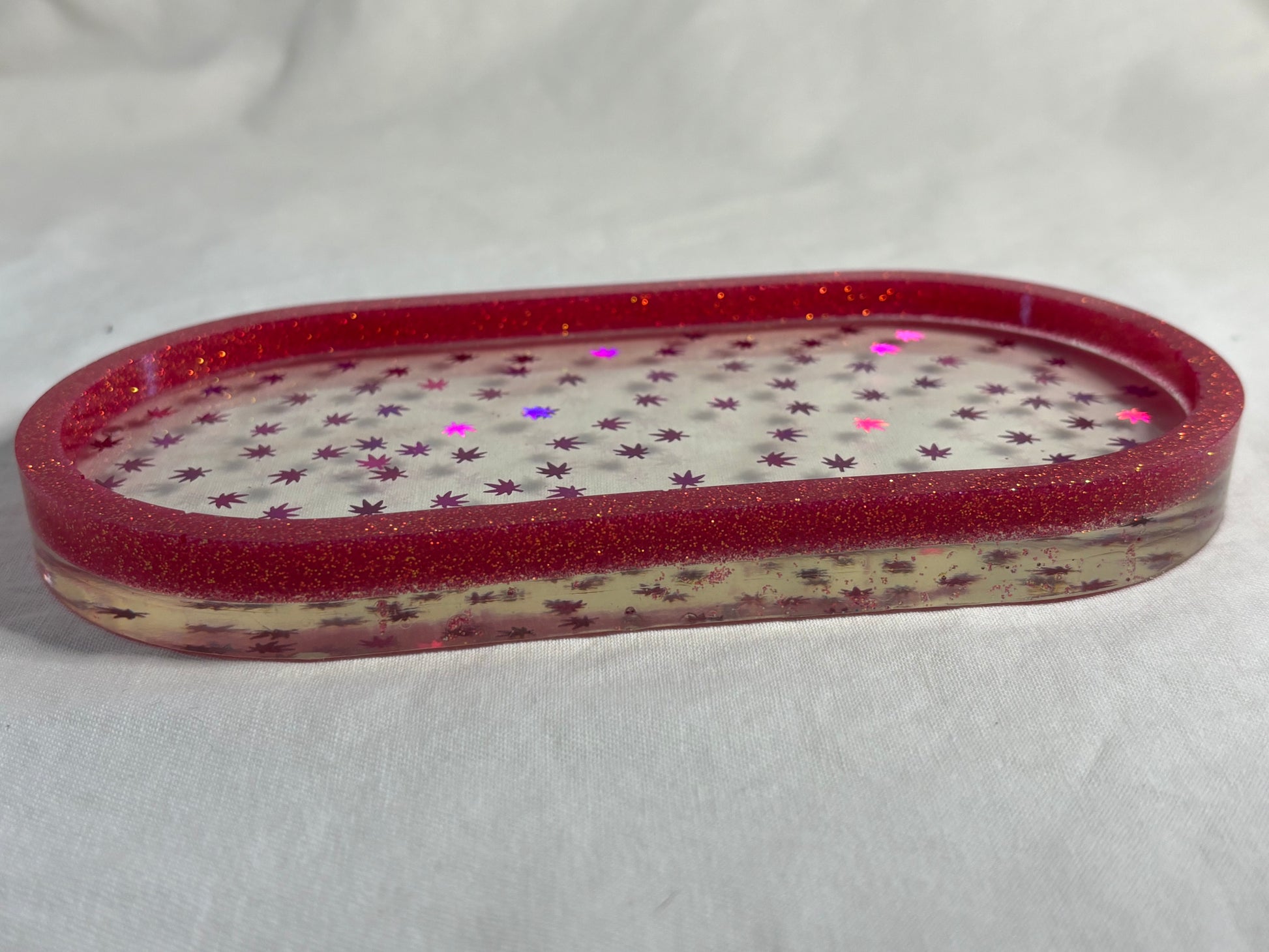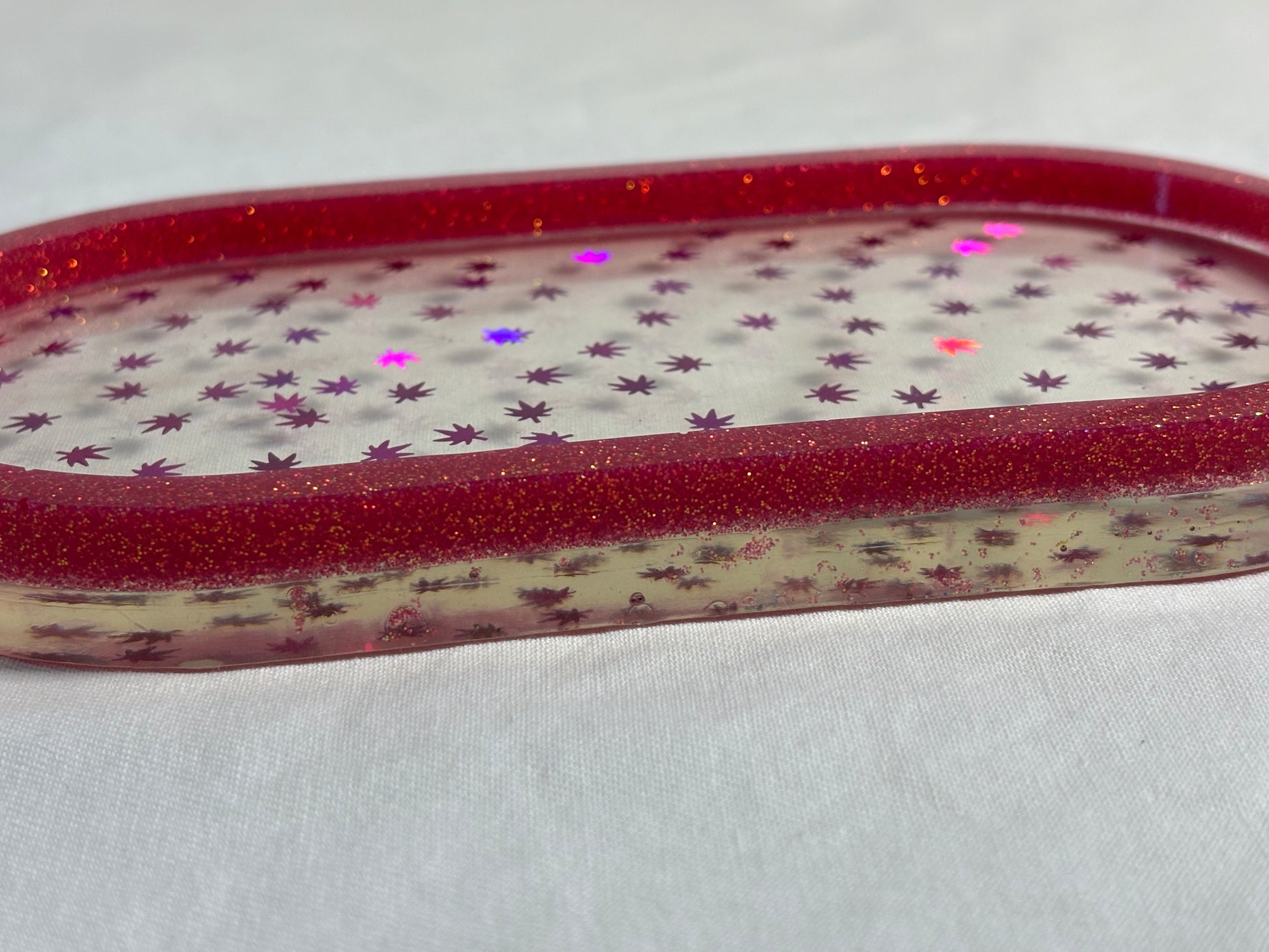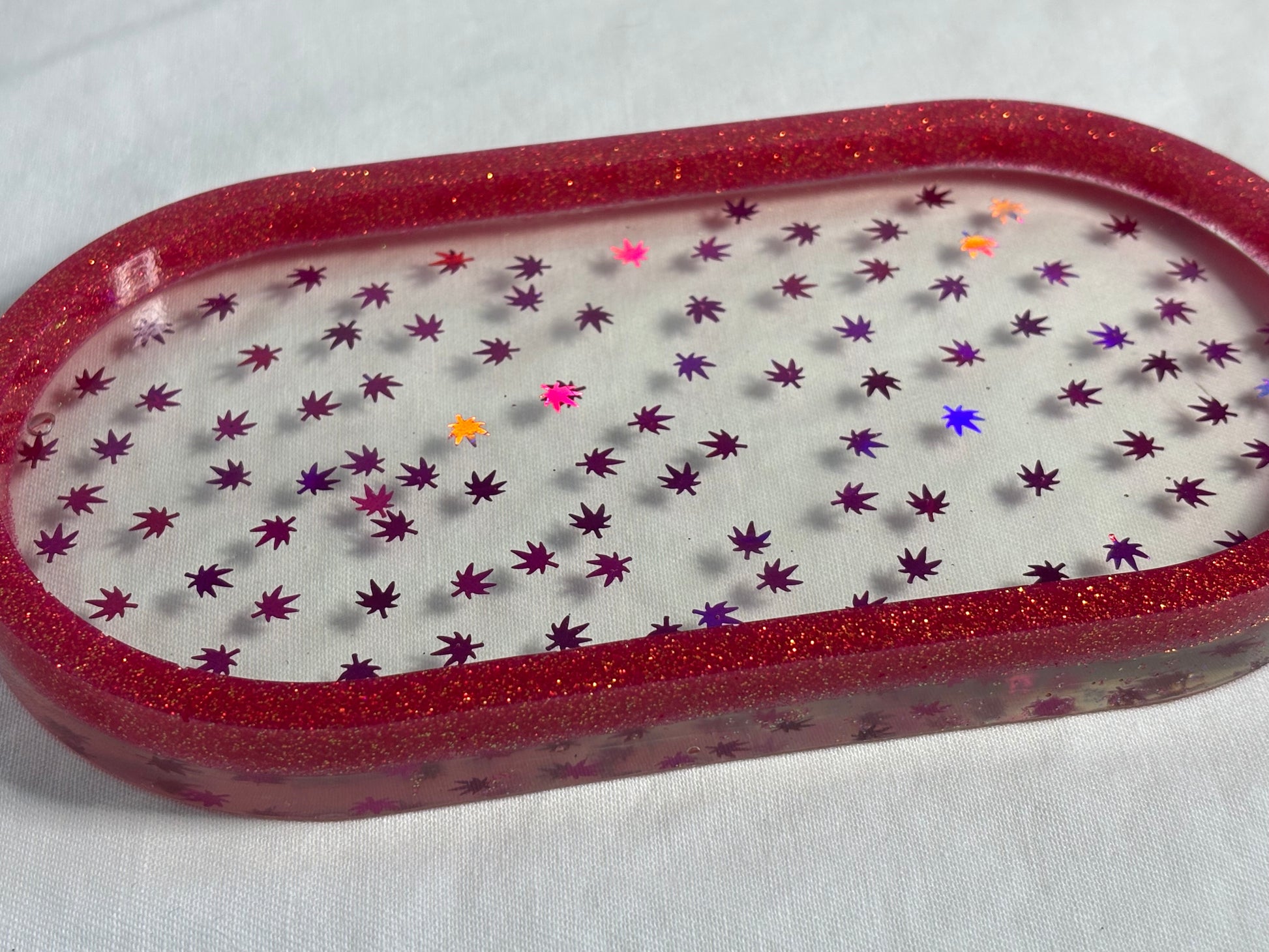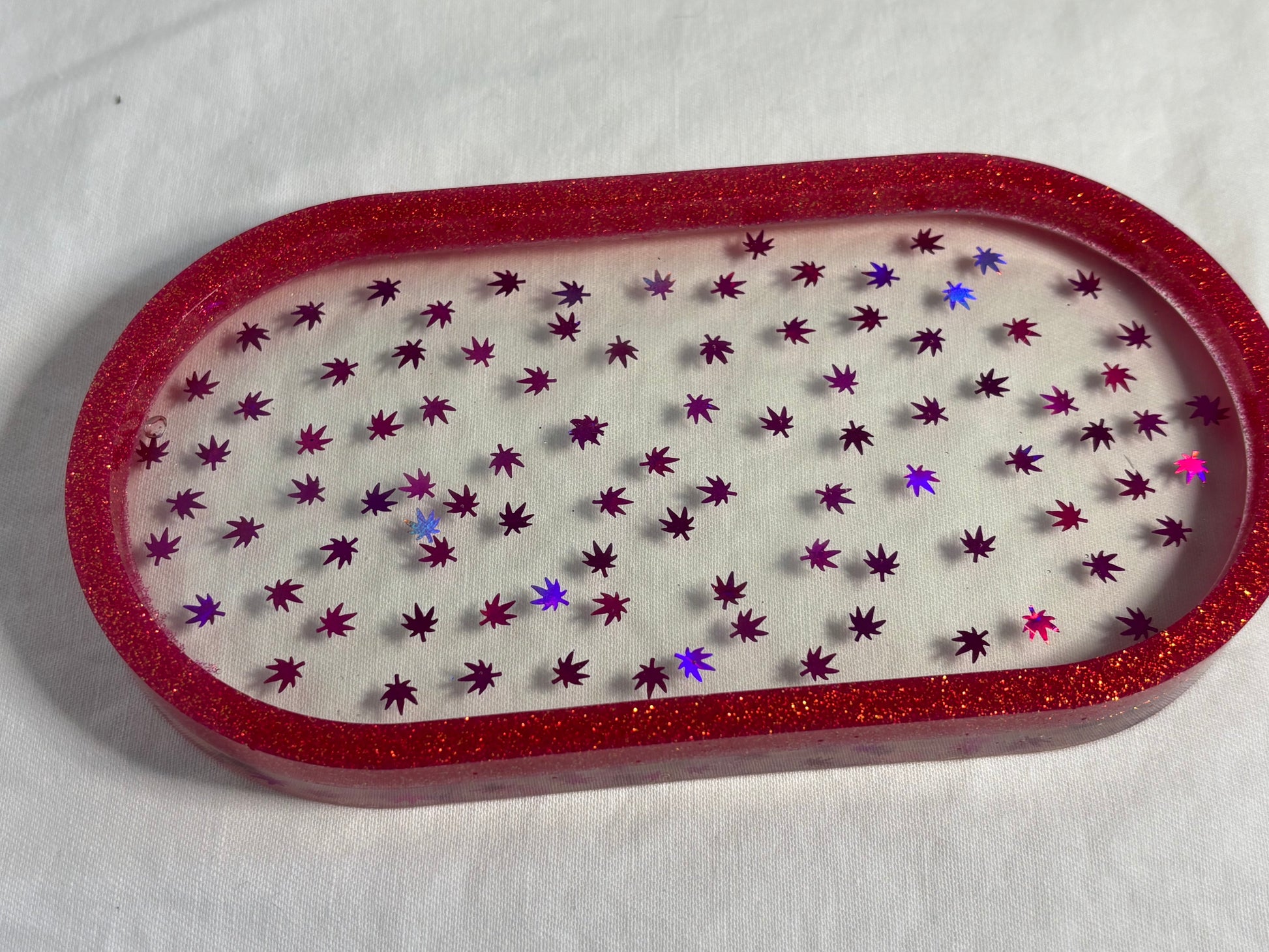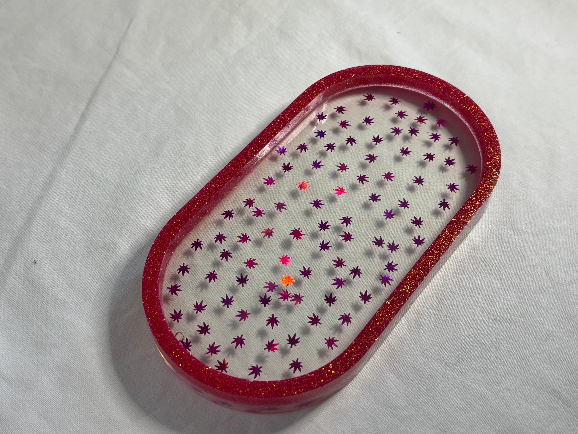 Add sparkle and fun to your everyday space with this handcrafted resin tray! Featuring a clear base, scattered holographic hot pink Mary Jane leaves, and a pink glittered edge, this tray is perfect for storing jewelry, keys, coins, or other little treasures while adding a playful, eye-catching accent to your room.