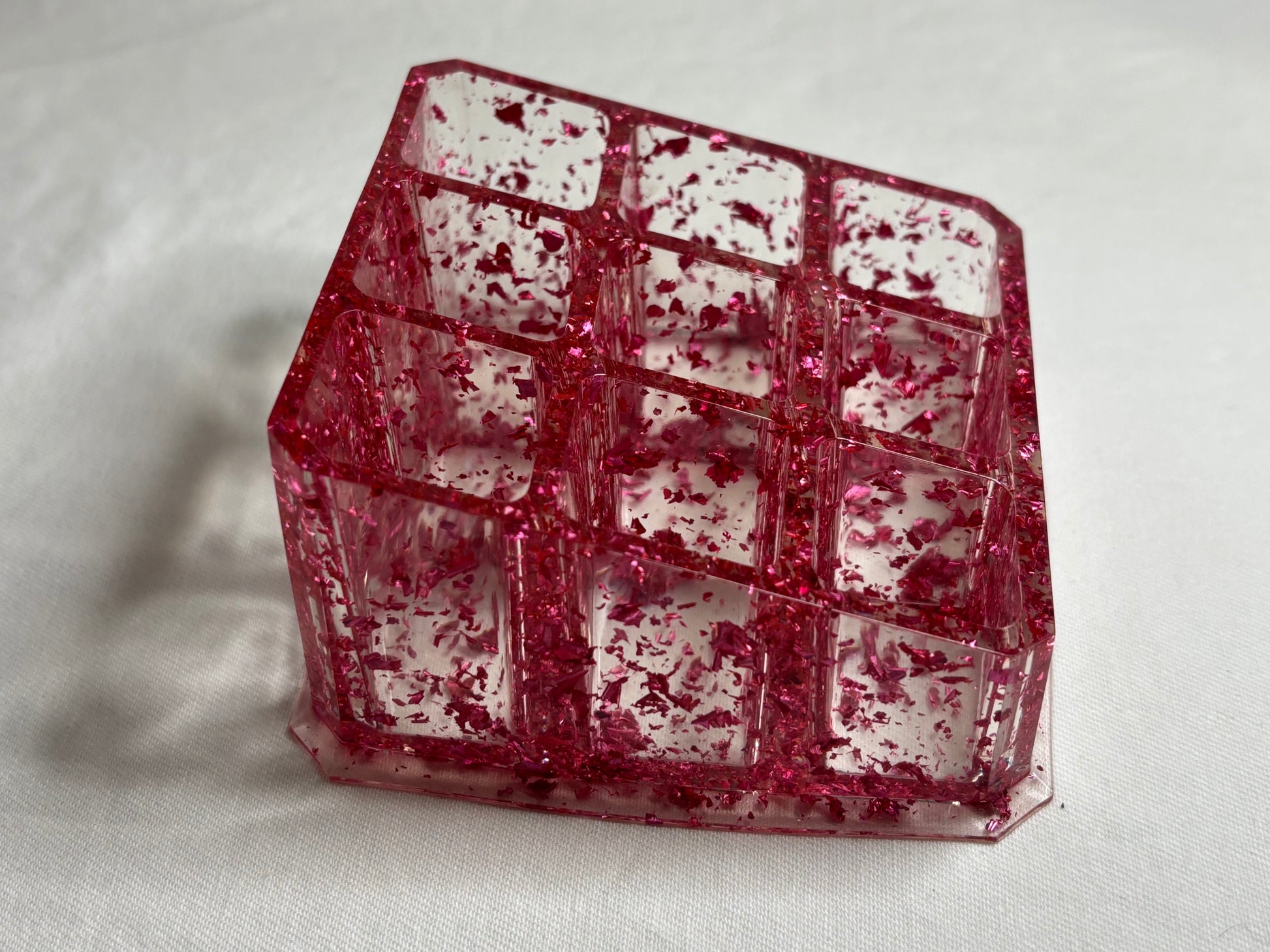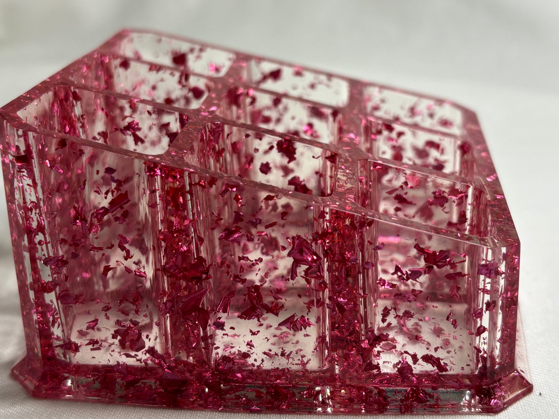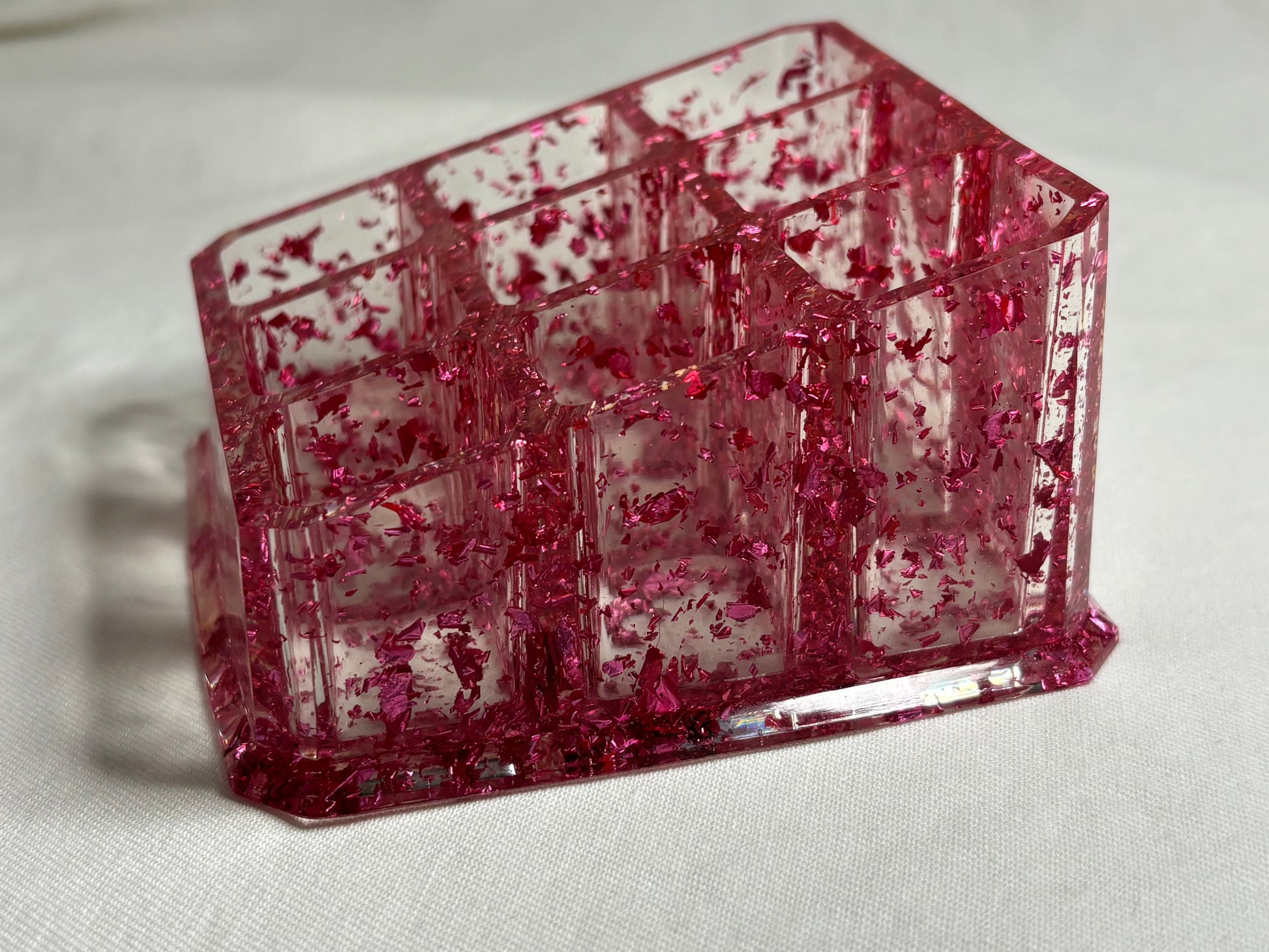 Say goodbye to cluttered makeup counters with this handcrafted resin cosmetic organizer, made with vibrant hot pink foil flakes that catch the light beautifully! With 9 perfectly sized slots, it’s ideal for holding lipsticks, mascaras, and other favorite beauty essentials.