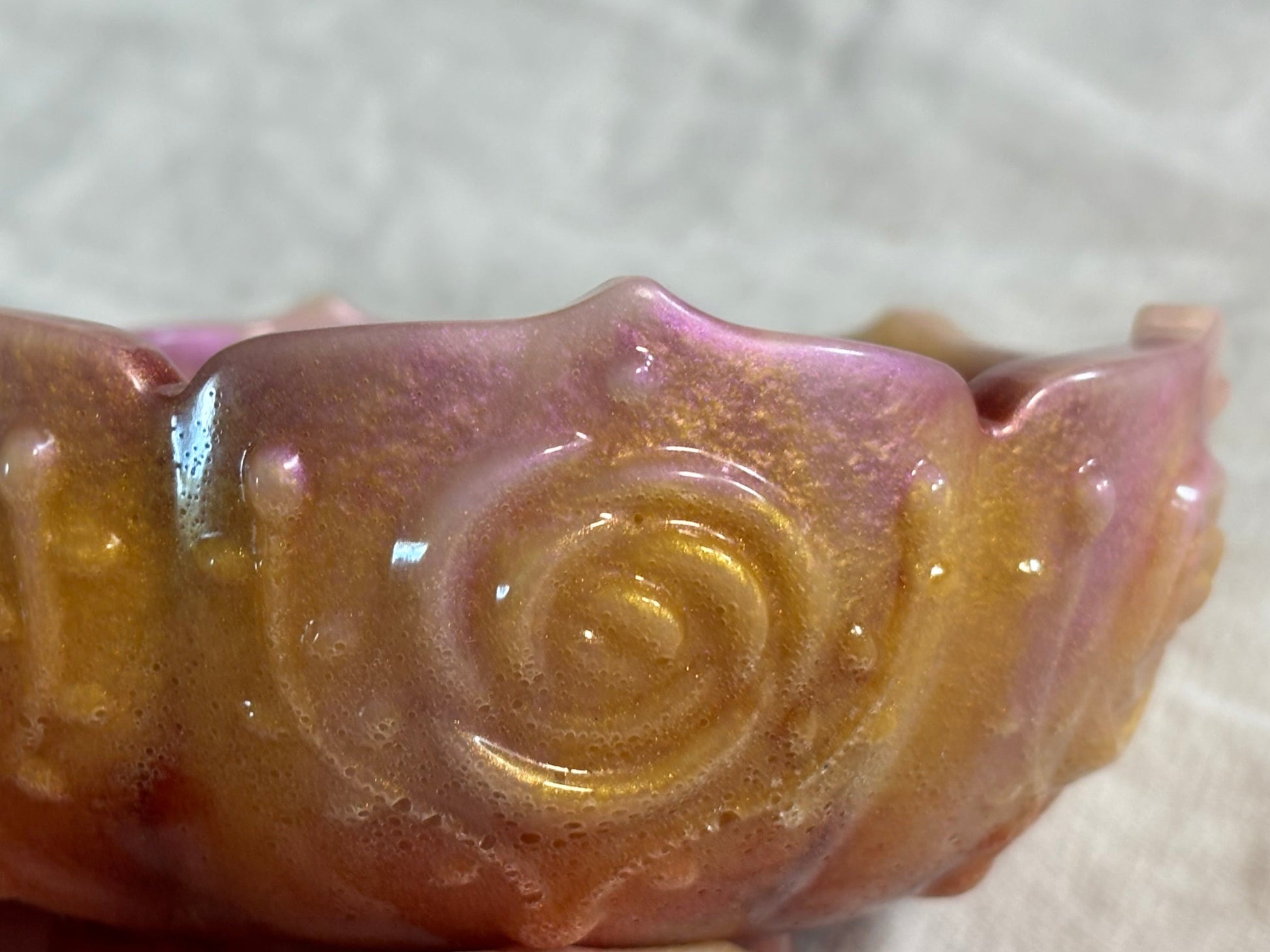 This handcrafted resin bowl glows with light pink, gold, and crimson mica powders, creating a soft yet dramatic color palette. Sculpted rose details along the outer edges add elegance and texture, making it a stunning piece for display or holding small treasures.