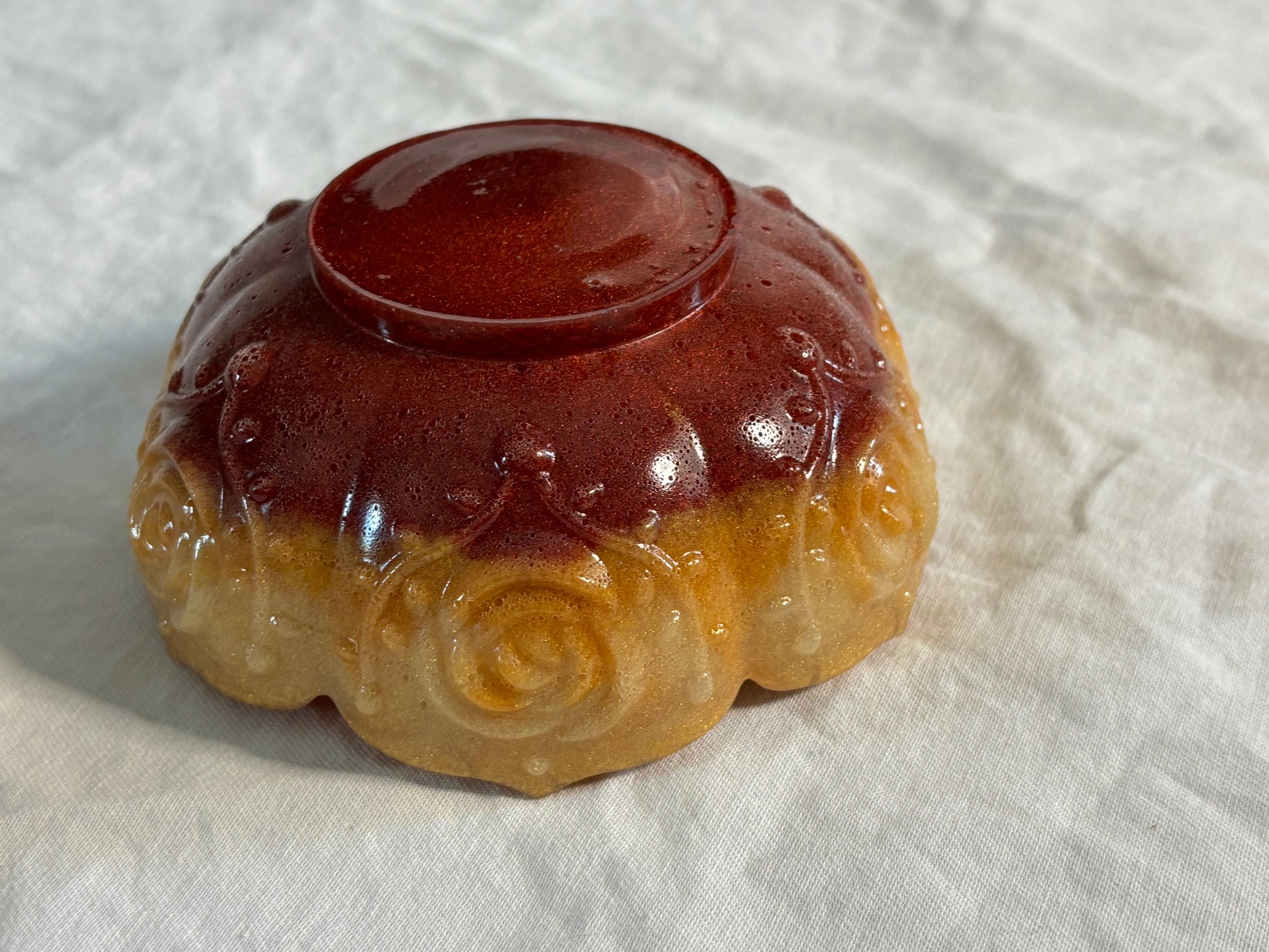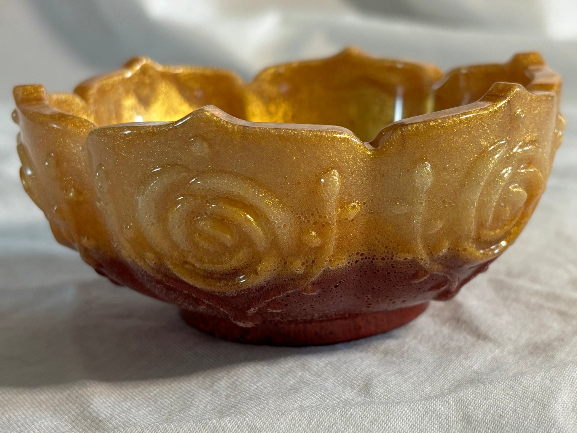 This handcrafted resin bowl glows with gold and crimson mica powders, reminiscent of a vibrant sunset, and features sculpted rose details along the outer edges. A perfect mix of warmth and elegance, it catches the light beautifully, making it both functional and decorative.