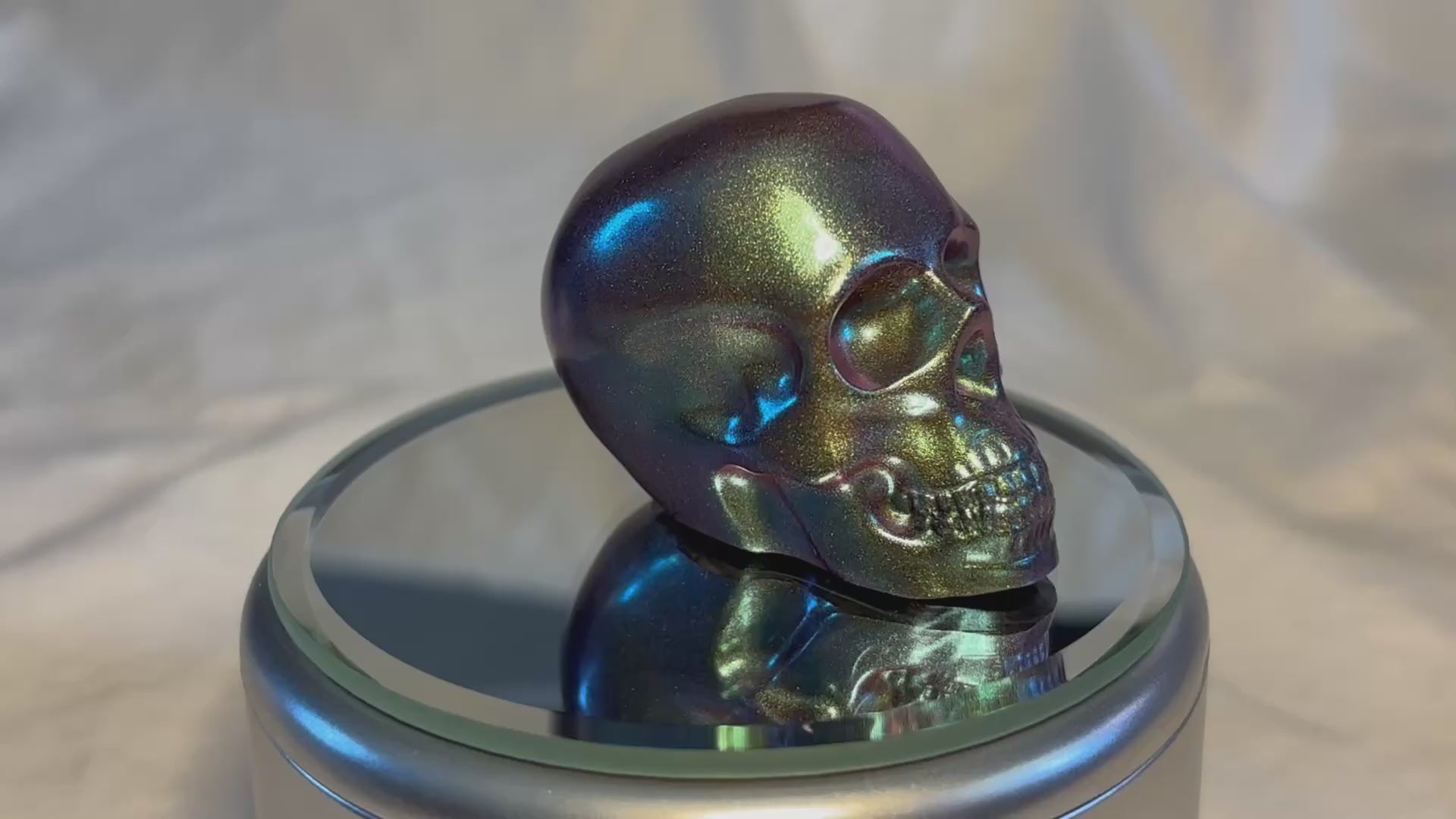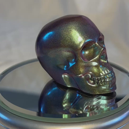 Add a touch of magic and edge to your collection with these "olive" metalic color shifting teal resin skulls. Measuring approximately 2 inches, each skull shimmers with iridescent hues that change as the light hits—making every piece feel alive and unique. Each skull is individually crafted. Bring a little magic (and a hint of mystery) to your space!