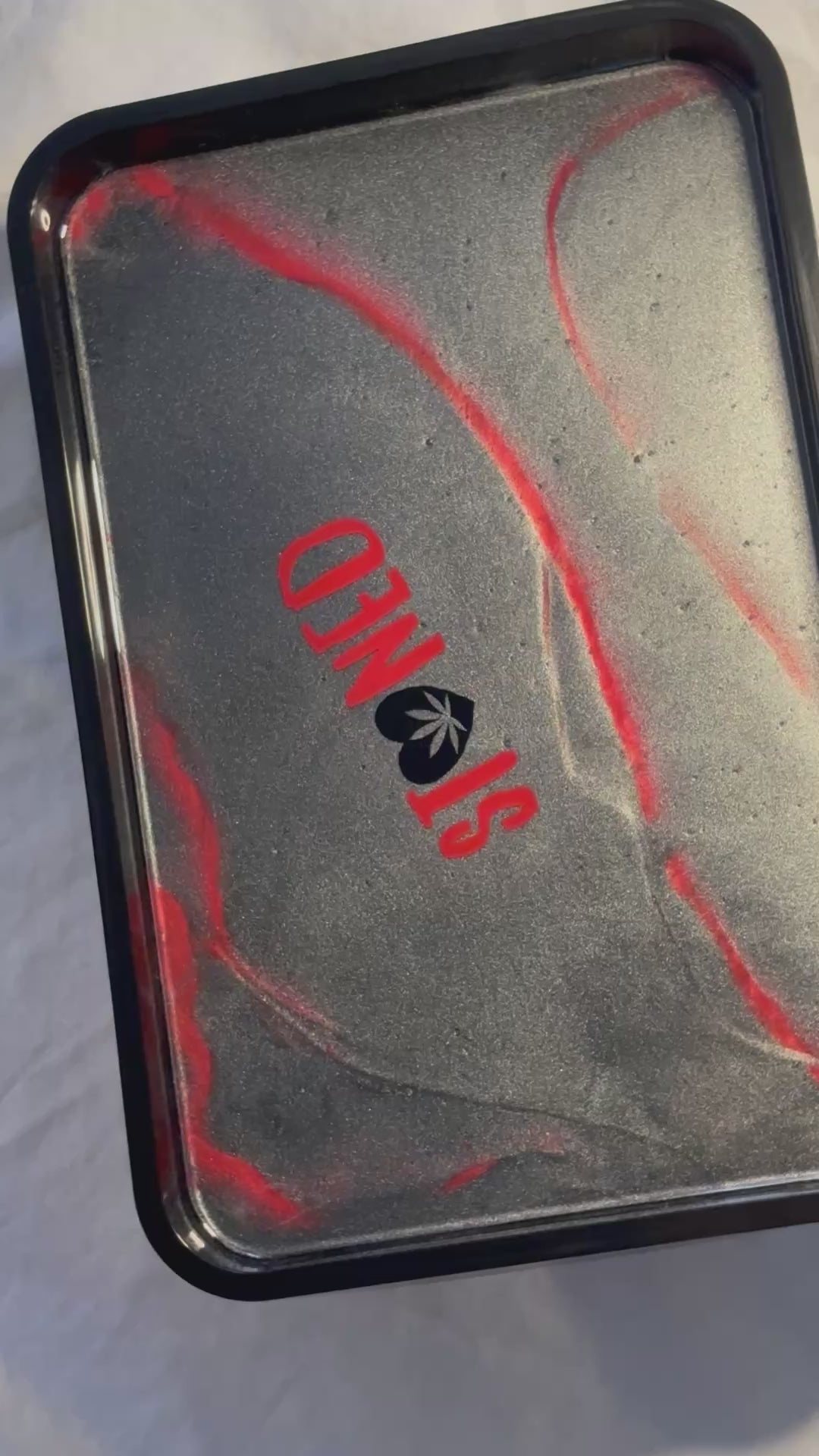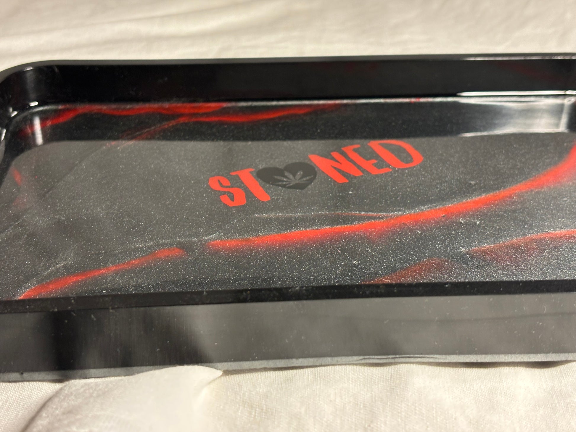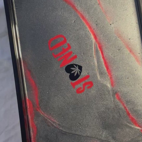 Make a statement with this handcrafted resin rolling tray, featuring a bold blend of charcoal and red mica powders with black mica edges. The center proudly displays the word “Stoned”, with a Mary Jane leaf cleverly replacing the “O”, combining function and playful artistry. Durable, eye-catching, and one-of-a-kind, it’s perfect for daily use or as a standout decorative piece.