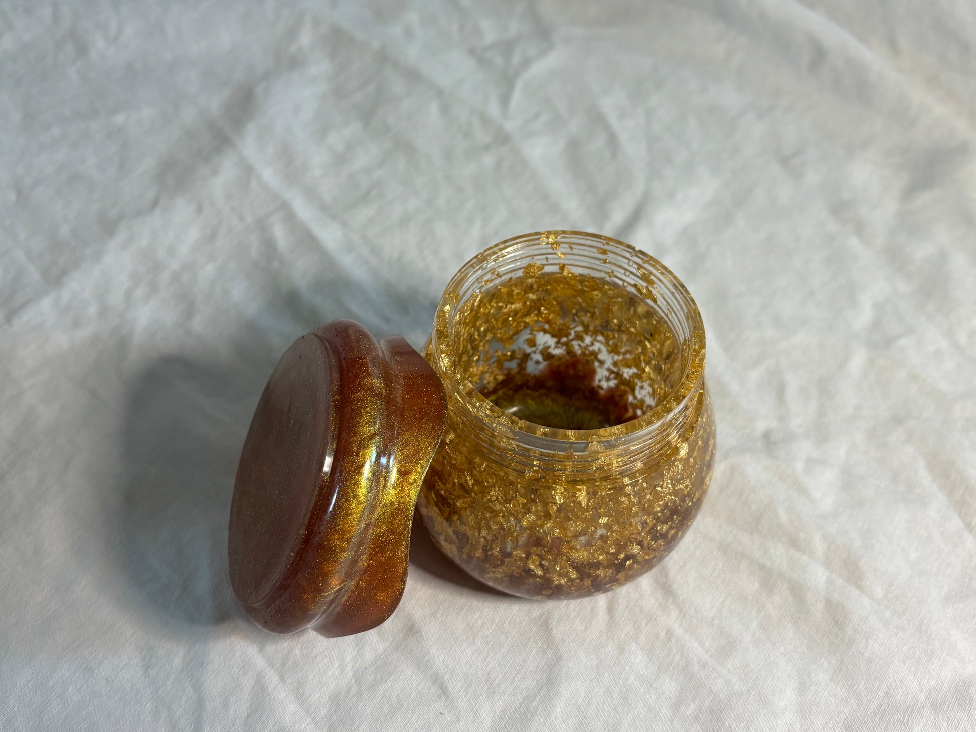 This handmade resin jar shimmers with a mix of gold mica and foil flakes, giving it a rich, sparkling finish. Featuring a secure screw-on lid, it’s both functional and decorative—perfect for storing jewelry, herbs, keepsakes, or tiny treasures.