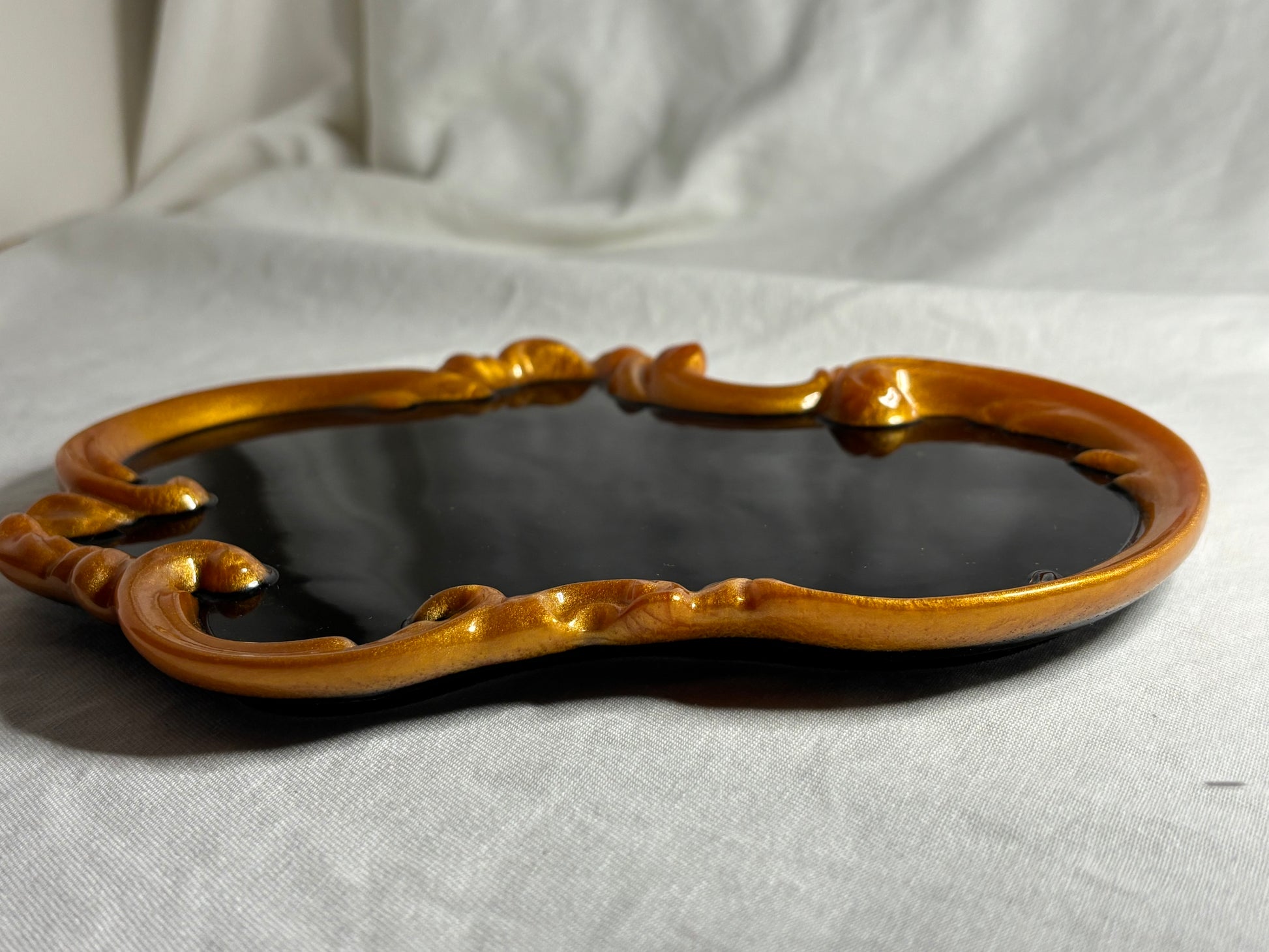 Add timeless elegance to your space with this handcrafted resin trinket tray! The center features rich black mica, while the outer edge shimmers with gold mica, creating a sophisticated, vintage-inspired look. Perfect for holding jewelry, keys, coins, or small treasures, this tray combines functionality with classic style.