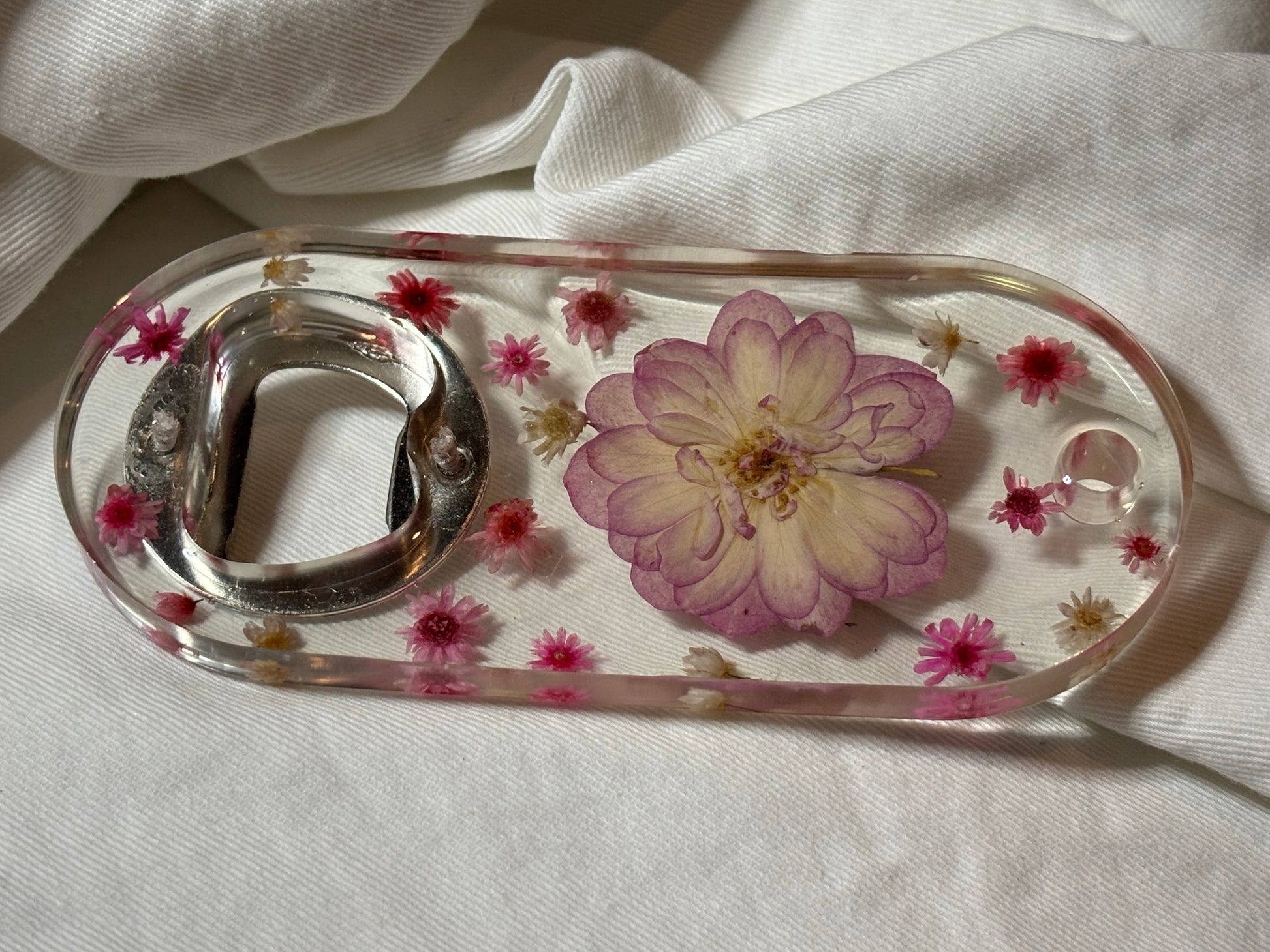 Pop bottles in style! This unique bottle opener is handcrafted and made with real dried pink flowers preserved in resin. Both beautiful and functional, it makes opening your favorite drinks a little more magical.