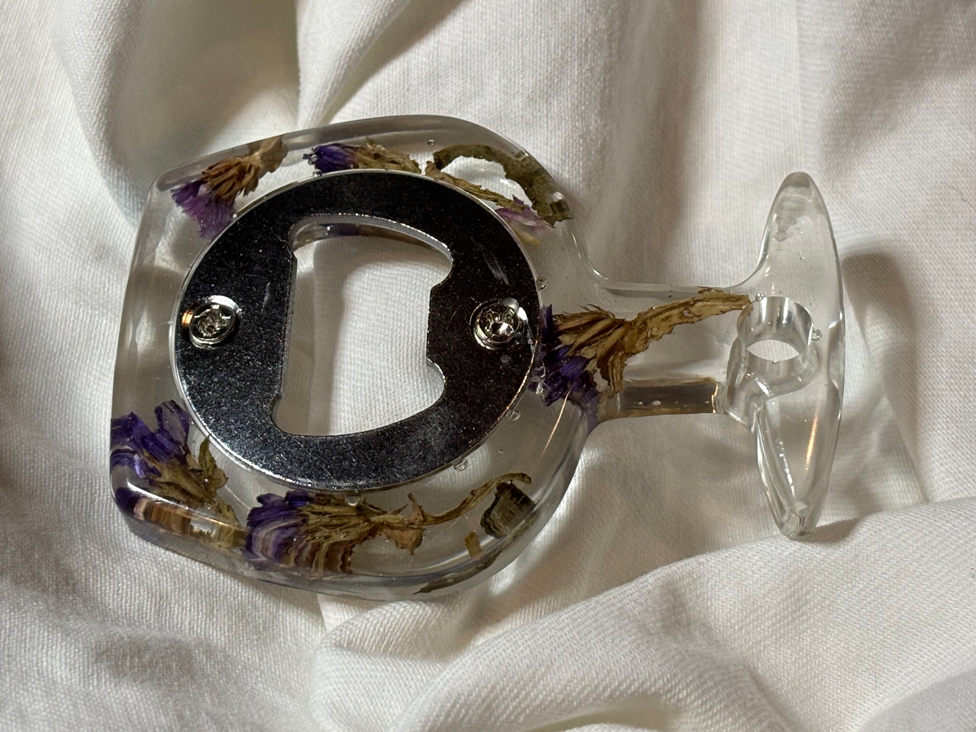 Pop bottles in style! This unique bottle opener is handcrafted in the shape of a bottle and made with real dried flowers preserved in resin. Both beautiful and functional, it makes opening your favorite drinks a little more magical.